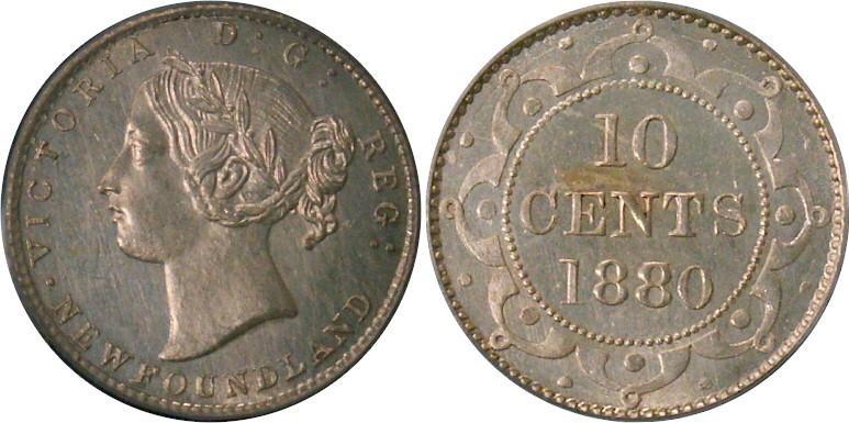 NFLD 1880 10¢ PCGS SP64. Full white with frostlike finish. Excessively scarce and desirable.