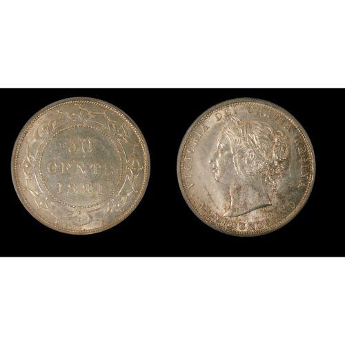 NFLD 1881 50¢ PCGS MS62, light golden tone over luster. Highly lustrous. A superb example for the grade assigned. Rare!