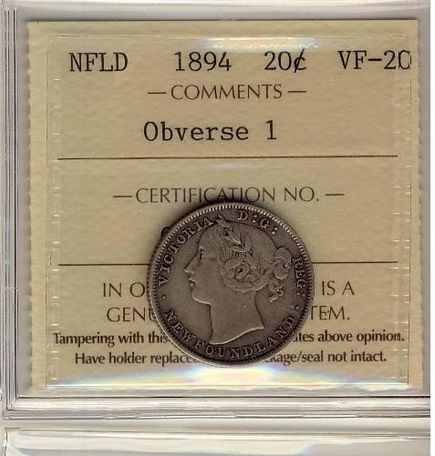 NFLD 1894 20¢ Obv 1 ICCS VF-20