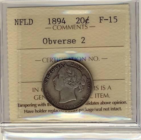 NFLD 1894 20¢ Obv 2 ICCS F-15
