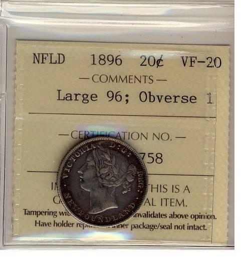 NFLD 1896 20¢ Large 96 Obv 1 ICCS VF-20