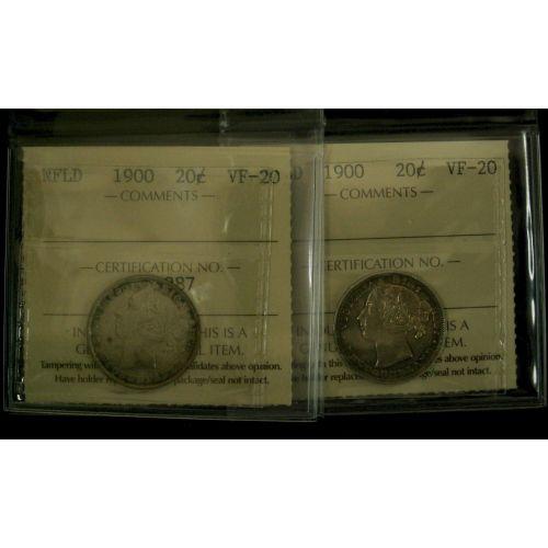 NFLD 1900 20¢. Lot of two coins both ICCS VF20.