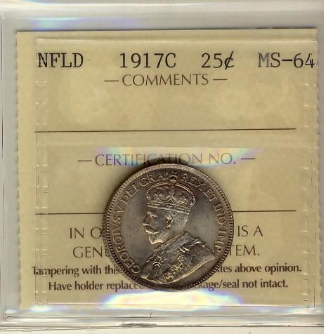 NFLD 1917C 25¢ ICCS MS64 nicely toned