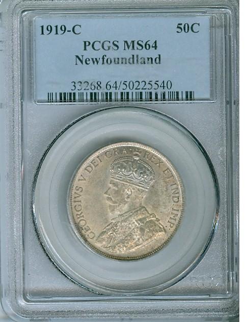NFLD 1919C 50¢ PCGS MS64PQ. Light russet tone over full underlying lustre. Nice coin!