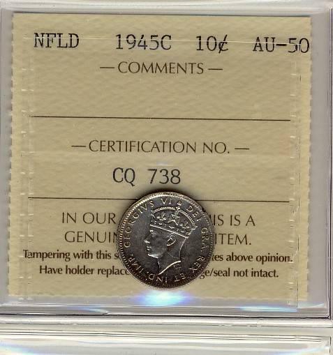 NFLD 1945C 10¢ ICCS AU-50