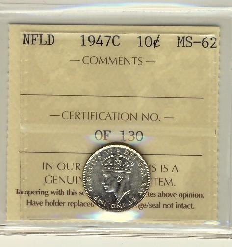 NFLD 1947C 10¢ ICCS MS62 Fully Brillant.