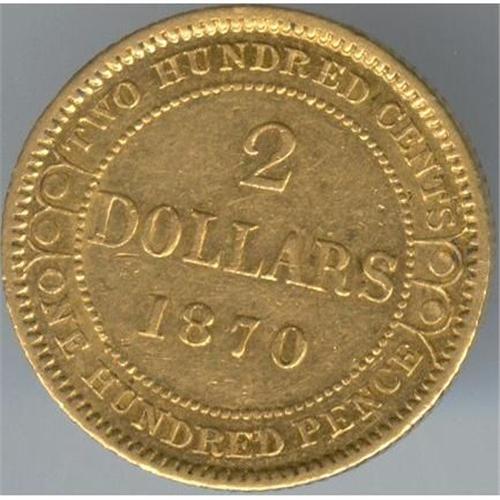 NFLD 2 dollar 1870, grade EF-45 Gold 2 Dots. Well struck with luster.