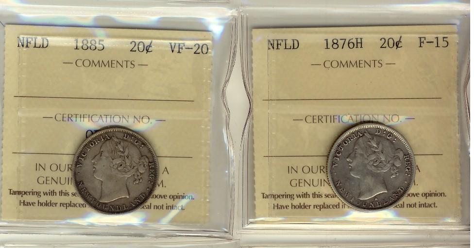 NFLD1876H 20¢ ICCS F15, 1885 20¢ ICCS VF20, Lot of 2 coins,