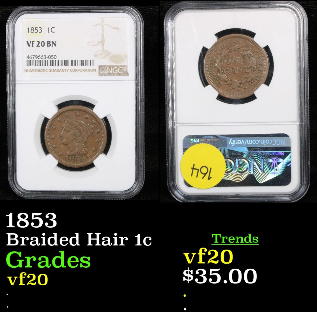 NGC 1853 . . Braided Hair Large Cent 1c Graded vf20 By NGC.