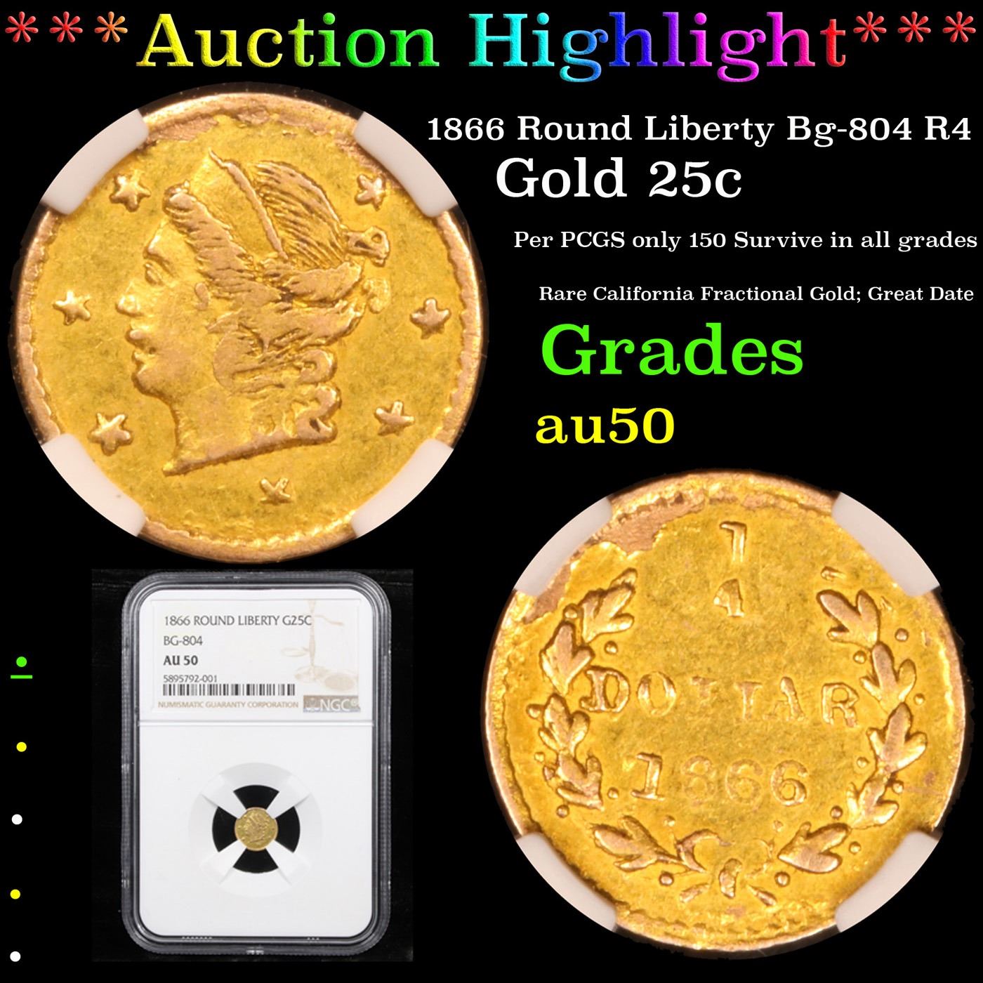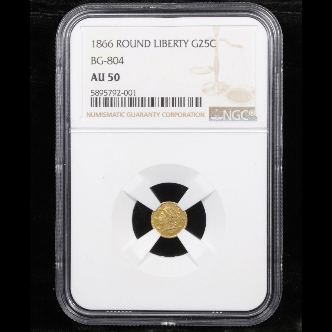 NGC 1866 Round Liberty Bg-804 R4 California Fractional Gold 25c Graded au50 By NGC.