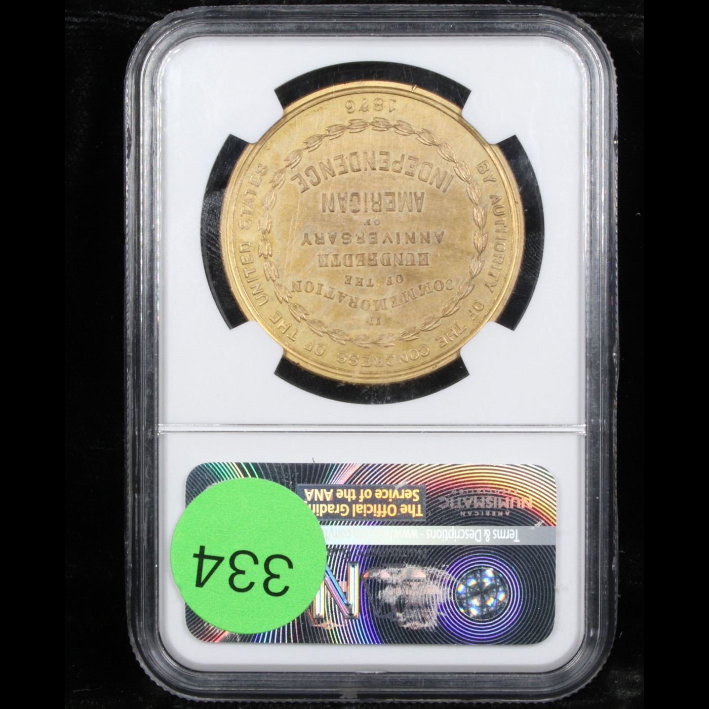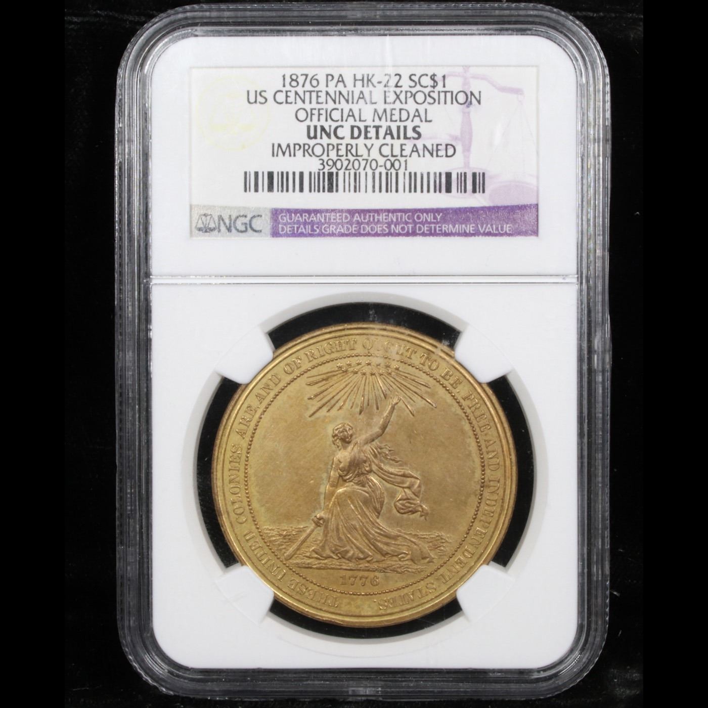 NGC 1876 PA HK-22 S.C. Dollar US Centennial Exposition Graded unc details By NGC. Up for Auction is a piece of American History which we have to date not been able to bring you. Up for auction is a $1 Gilt covered “So-Called” Dollar. It was Authorized by the United States Congress in 1876 to celebrate the “Centennial” exposition. It was called a “so-Called” Dollar because it was spendable at the exposition as a Dollar. Most people took them home as souvenirs. Many were not properly handled as most went to non numismatists. The one at hand is certified by NGC as Unc Details. It had at one time been wiped clean and a few hairlines were left behind. Nonetheless, it is an important piece of US History and a wonderful Example. The Obverse reads “THESE UNITED COLONIES ARE AND OF RIGHT OUGHT TO BE, FREE AND INDEPENDENT STATES. And is dated 1776. The Reverse reads “BY AUTHORITY OF THE CONGRESS OF THE UNITED STATES IN COMMEMORATION OF THE HUNDREDTH ANNIVERSARY OF AMERICAN INDEPENDENCE”, and is dated 1876 (note the date is wildly doubled). I think after this auction ends I’m going to hunt one down for my own collection I liked this so much, lol.