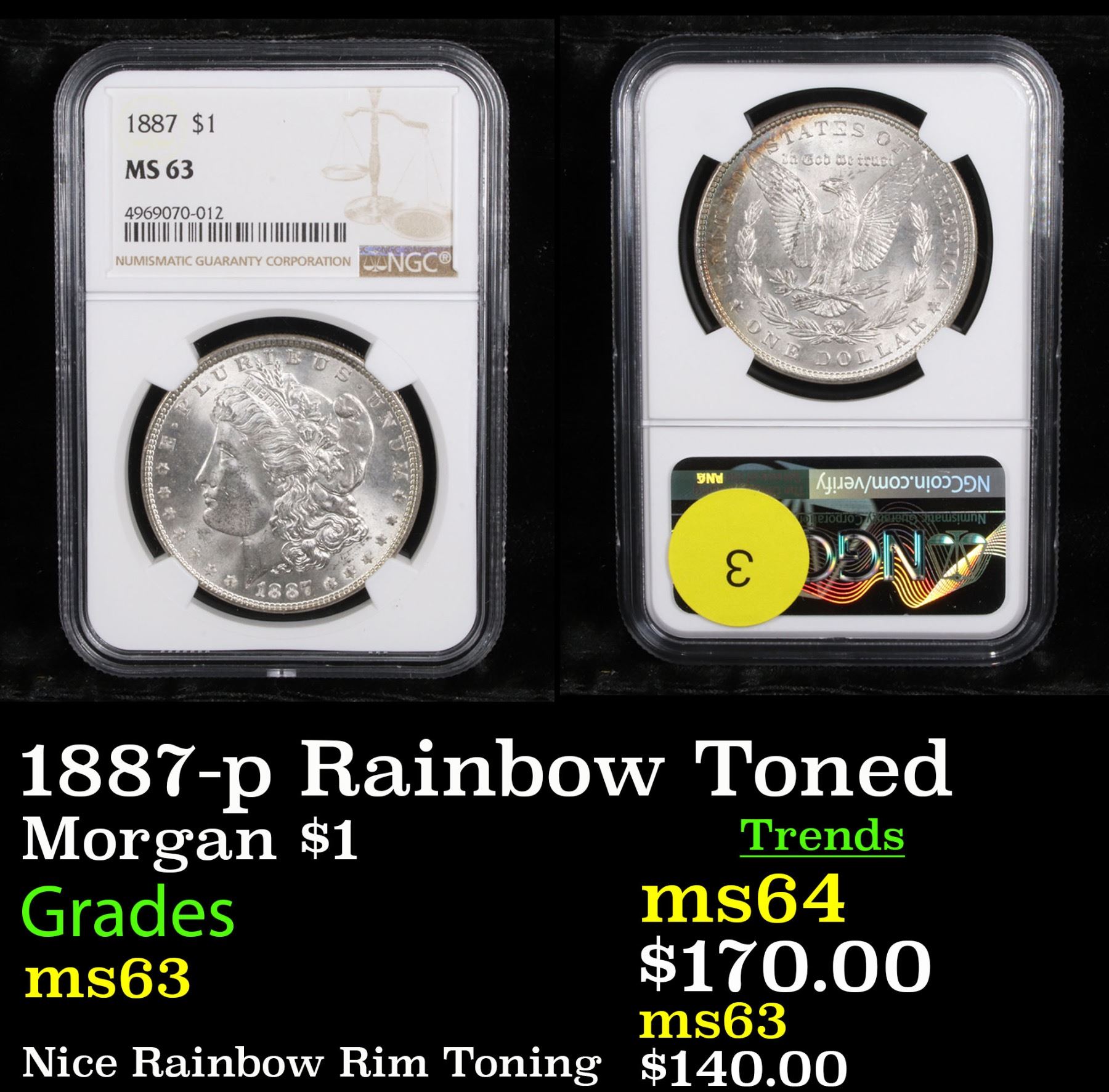 NGC 1887-p Rainbow Toned Morgan Dollar $1 Graded ms63 By NGC.