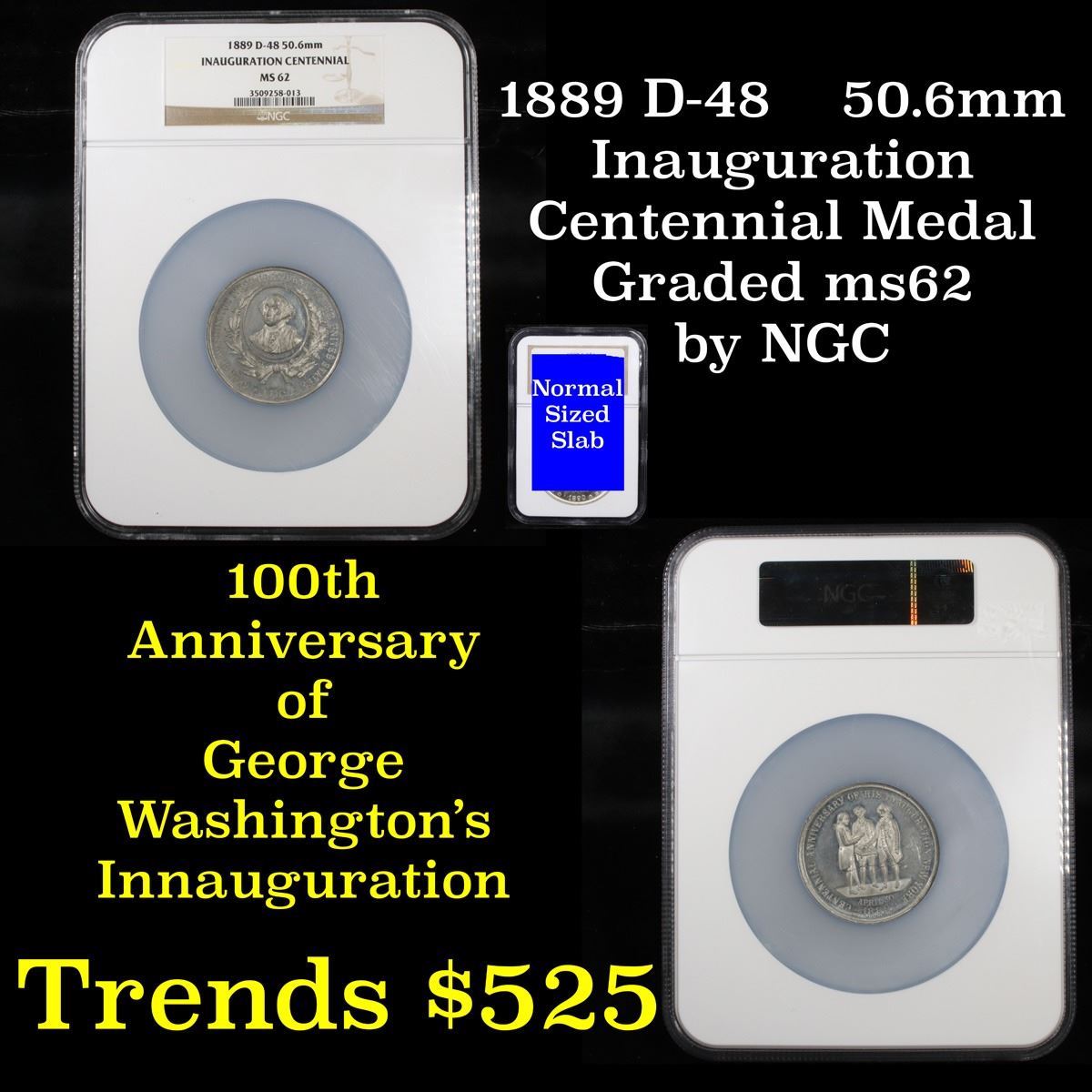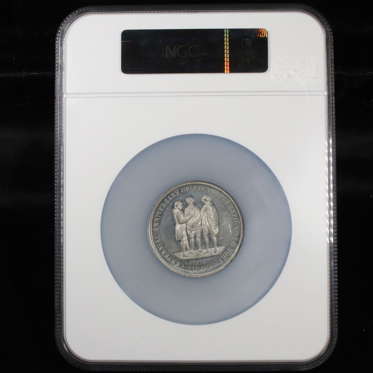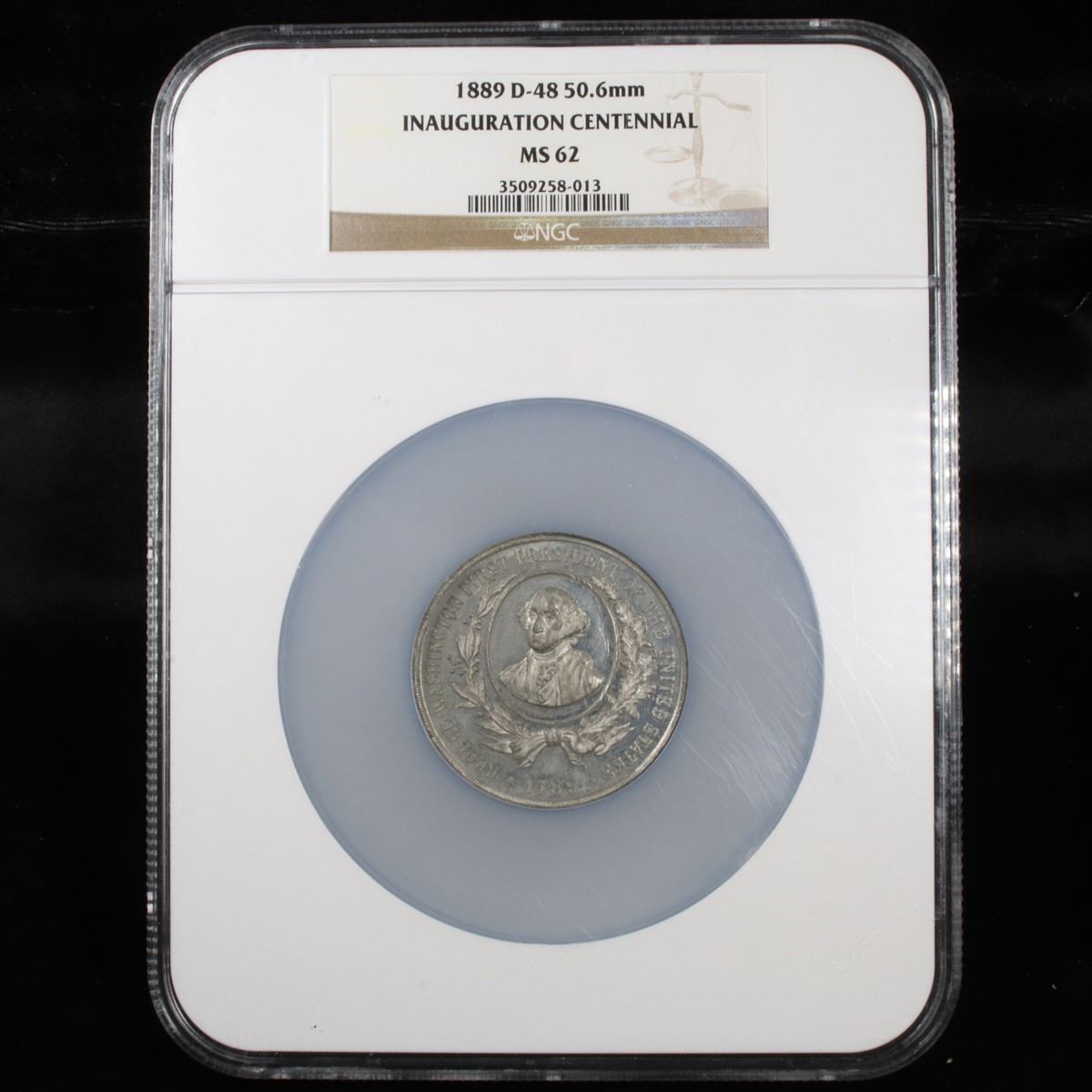 NGC 1889 D-48 50.6mm Oversized Slab Washington Inauguration Centennial Medal Graded ms62 By NGC. Up for Auction is an 1889 Washington Inauguration Centennial Medal graded ms62 by NGC and encased in a 2 ½ times normal size case! The Medal celebrated the 100th Anniversary of Washington’s Innauguration. It is cataloged as the Douglas-48, Musante GW-1134. White metal, 51mm, plain edge.