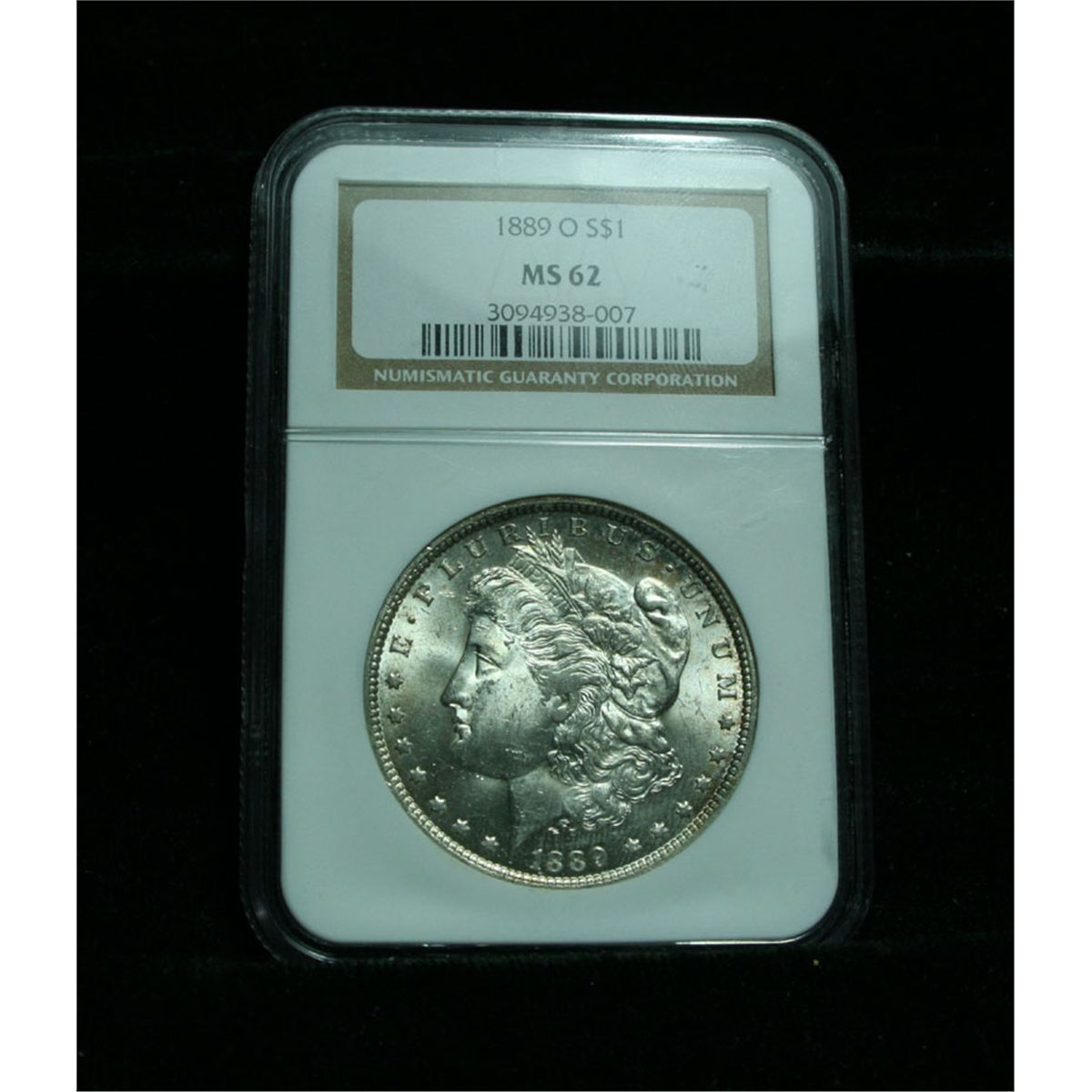 Terrific example of a better date Morgan. This coin has Pretty Golden Rim Toning. Upon examination it also "appears" to have a wild doubled mint mark. I say "appears" because the doubling is due to "machine Doubling" and is not considered a doubled mintmark as the doubling effect is unique to just this one coin and was caused most probably to a "loose die" in the striking. If your not sure of the difference between no value added "Machine Doubling" and sometimes valuable "Doubled Dies" this would be a great coin to own and have a look at so as to make it easier to try and cherry pick at coin shows. Graded by one of the top 2 grading companies in America. The Wholesale Greysheet lists ms63 at $320. Estimated Value $300