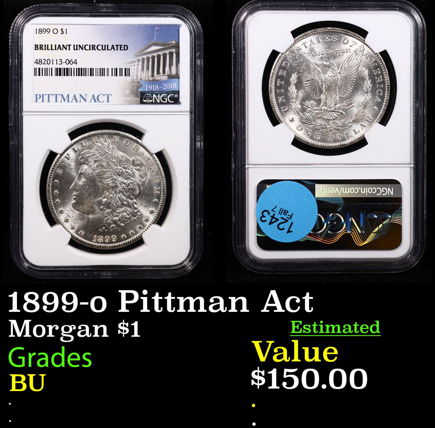 NGC 1899-o Pittman Act Morgan Dollar $1 Graded BU By NGC. On April 23, 1918, the Pittman Act was enacted. A Law sponsored by Nevada Senator Key Pittman, it directed the government of the United states to collect massive quantities of U.S. silver dollars and melt them down, both for sales to Great Britain, and for the striking of new U.S. silver dollars. At the time, the Morgan Silver Dollar was still in use, having been struck from silver mined from the famous Comstock Lode in the days of the Wild West. Hundreds of millions of these coins were struck, but thanks to the Pittman Act, hundreds of millions were bought up by the U.S. government and melted down. This single act, plus the ravages of time and circulation, has led experts to believe that as little as 15% of all Morgans still exist today in any condition.