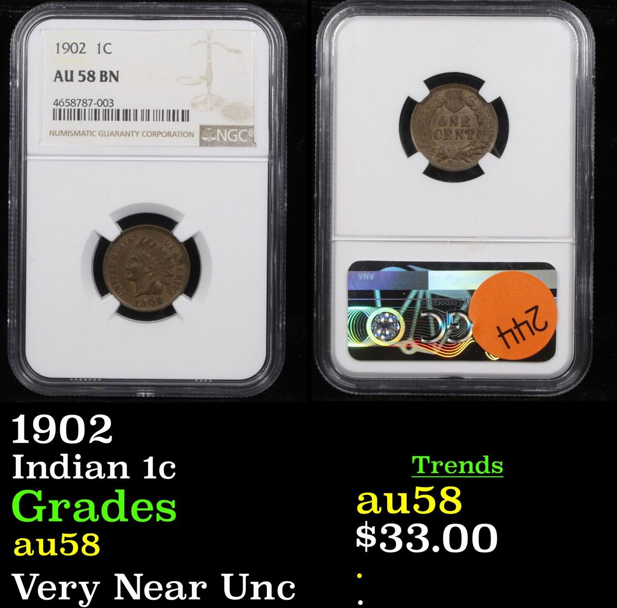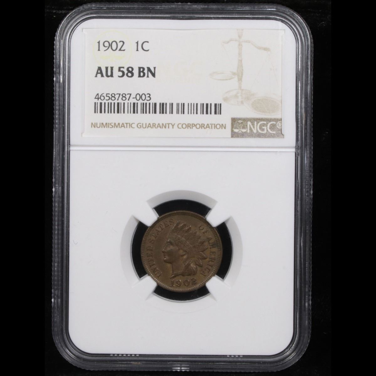 NGC 1902 Indian Cent 1c Graded au58 By NGC.