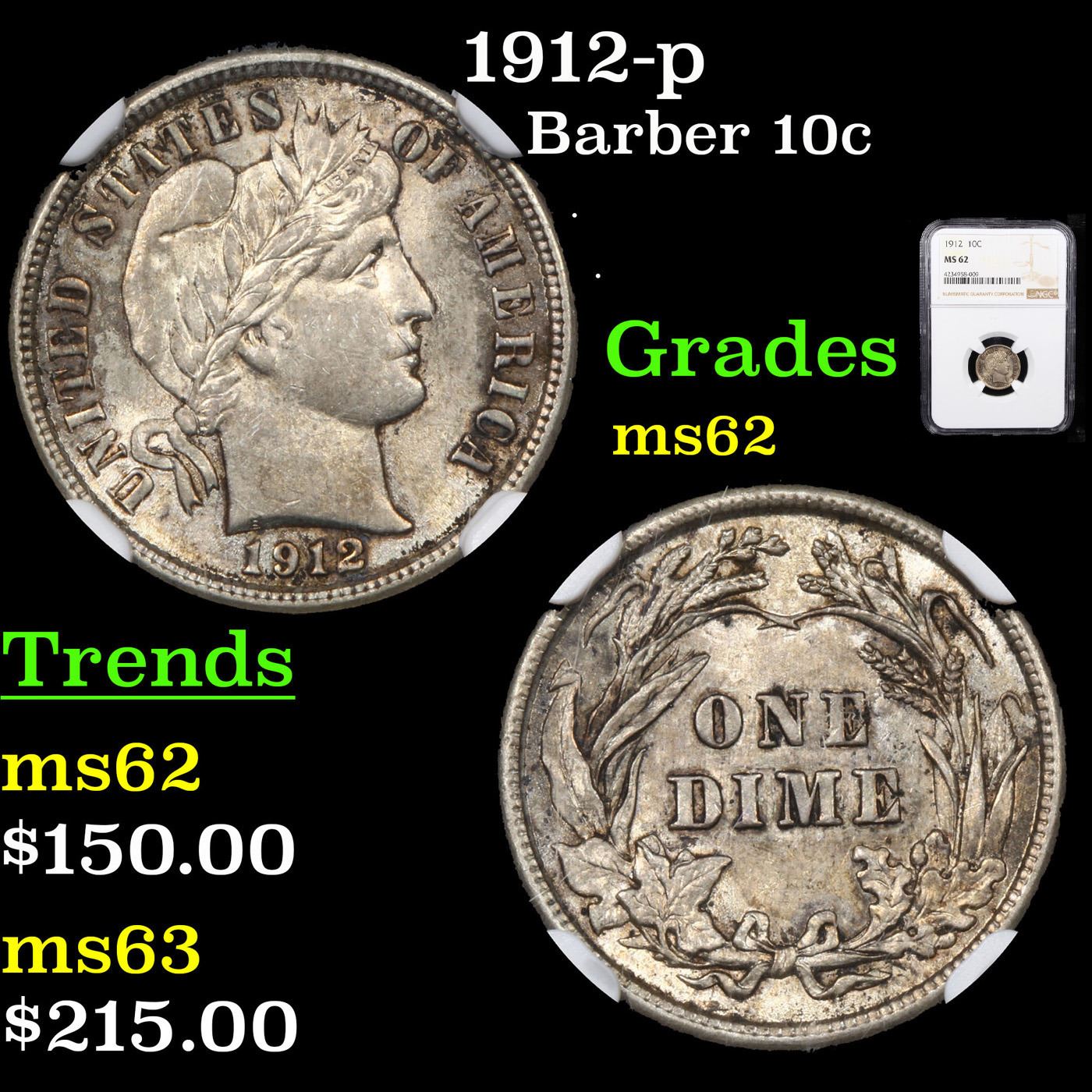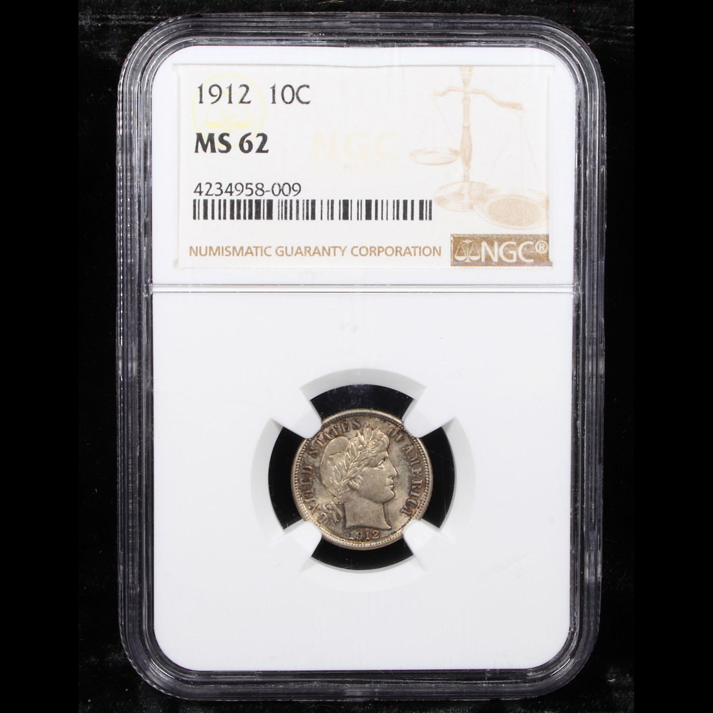 NGC 1912-p Barber Dime 10c Graded ms62 By NGC.