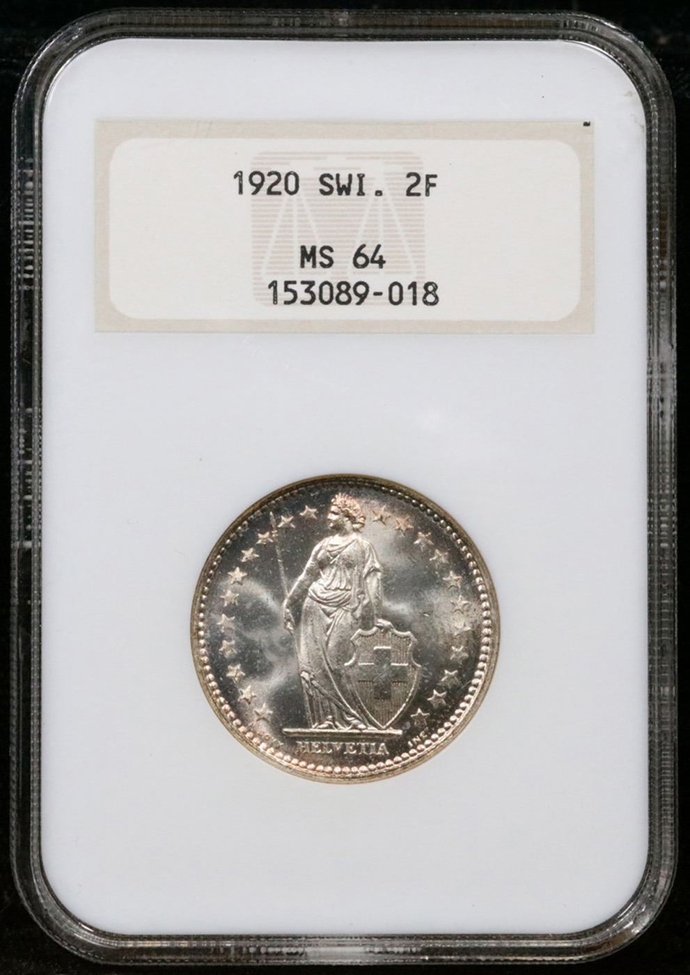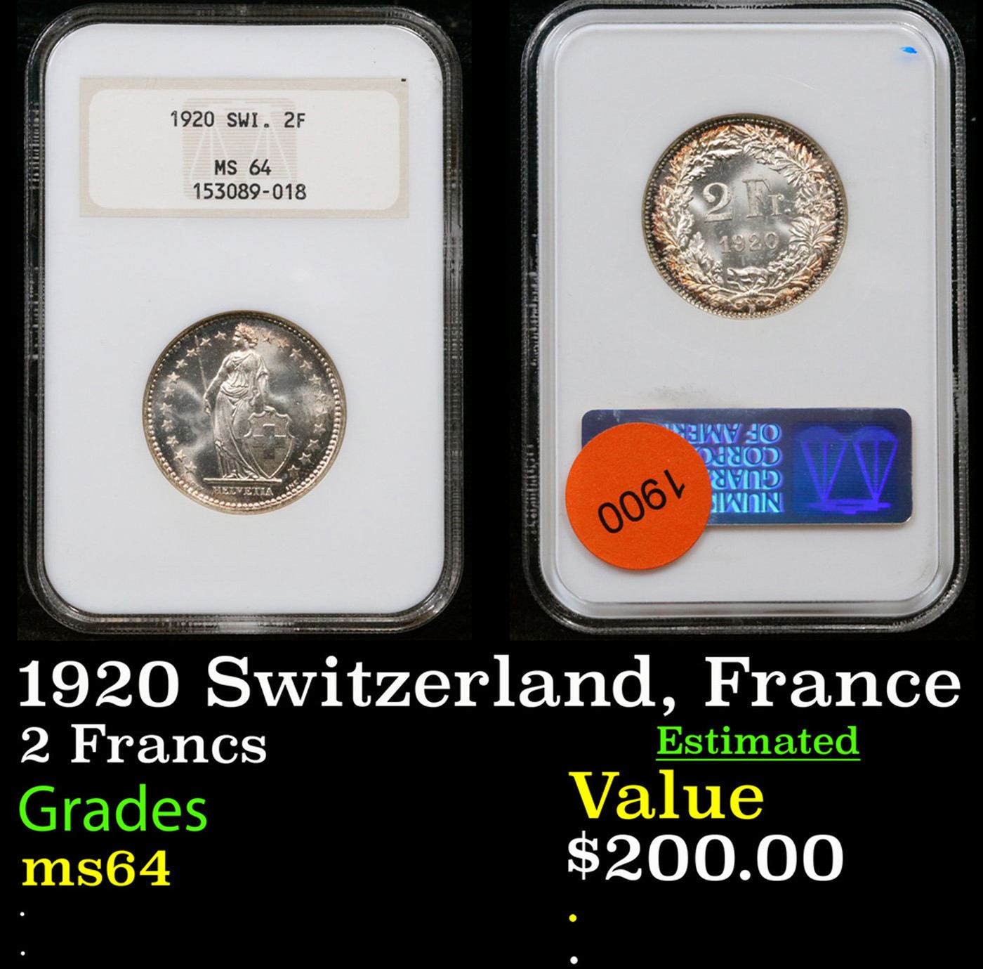 NGC 1920 Switzerland, France 2 Francs Graded ms64 By NGC.