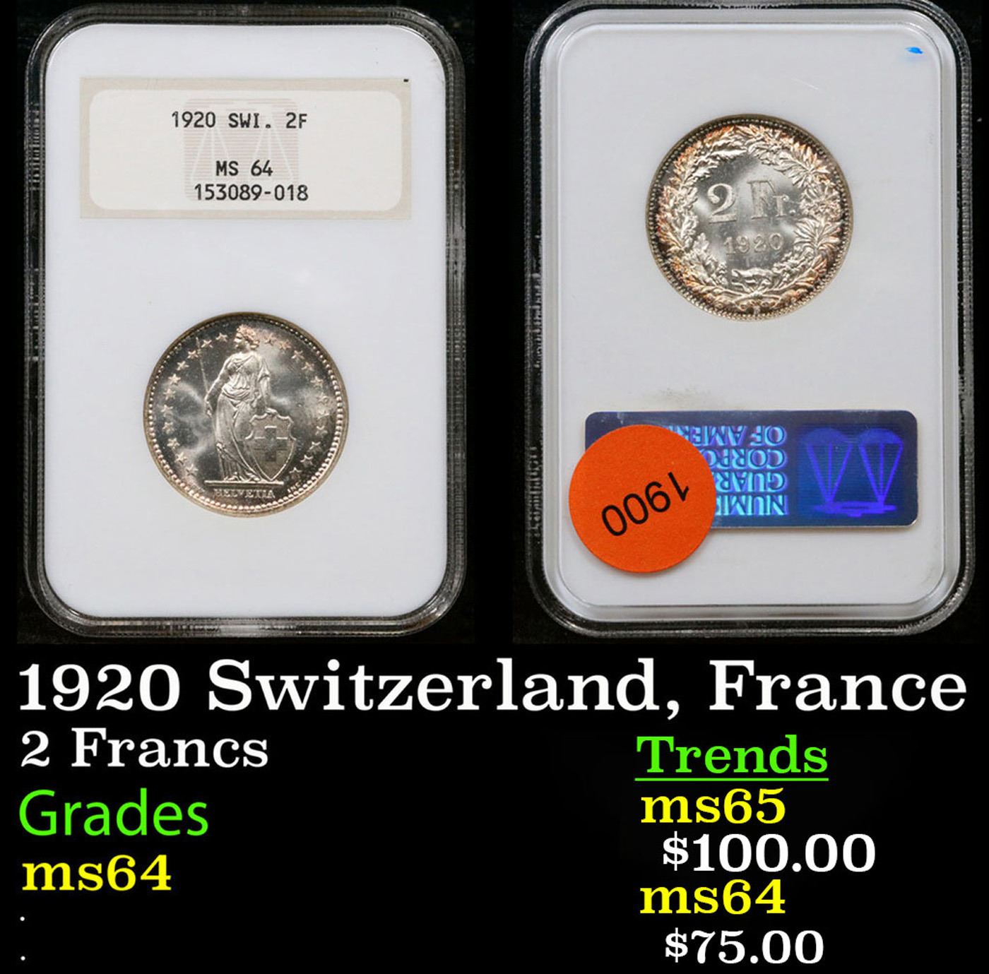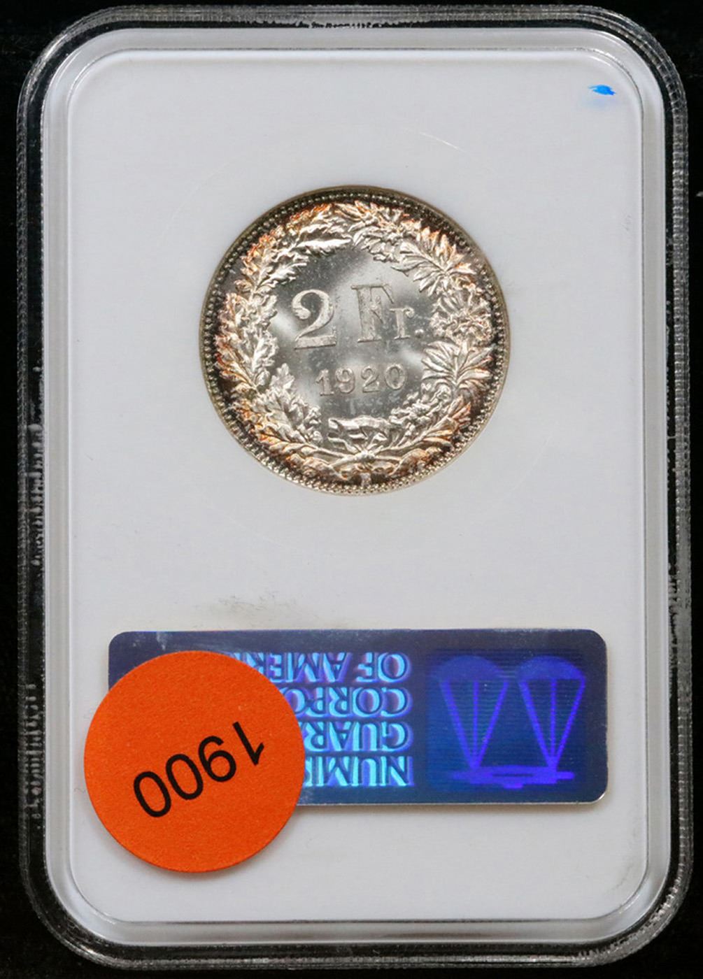 NGC 1920 Switzerland, France 2 Francs Graded ms64 By NGC.