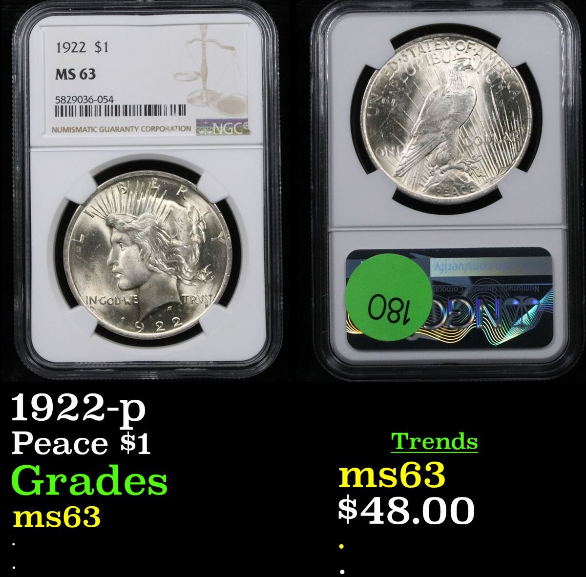 NGC 1922-p Peace Dollar $1 Graded ms63 By NGC.