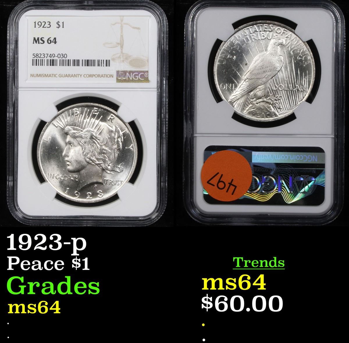 NGC 1923-p Peace Dollar $1 Graded ms64 By NGC.