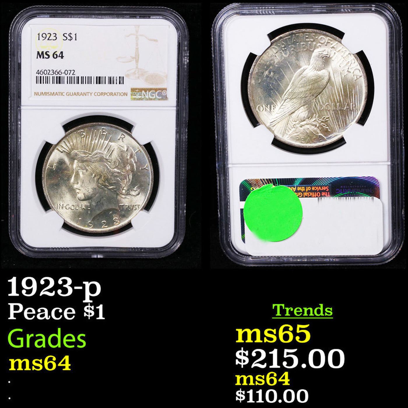 NGC 1923-p Peace Dollar $1 Graded ms64 By NGC.