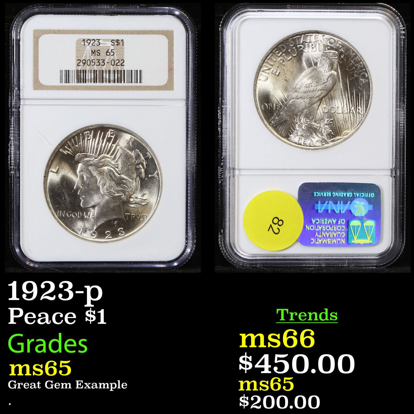 NGC 1923-p Peace Dollar $1 Graded ms65 By NGC.