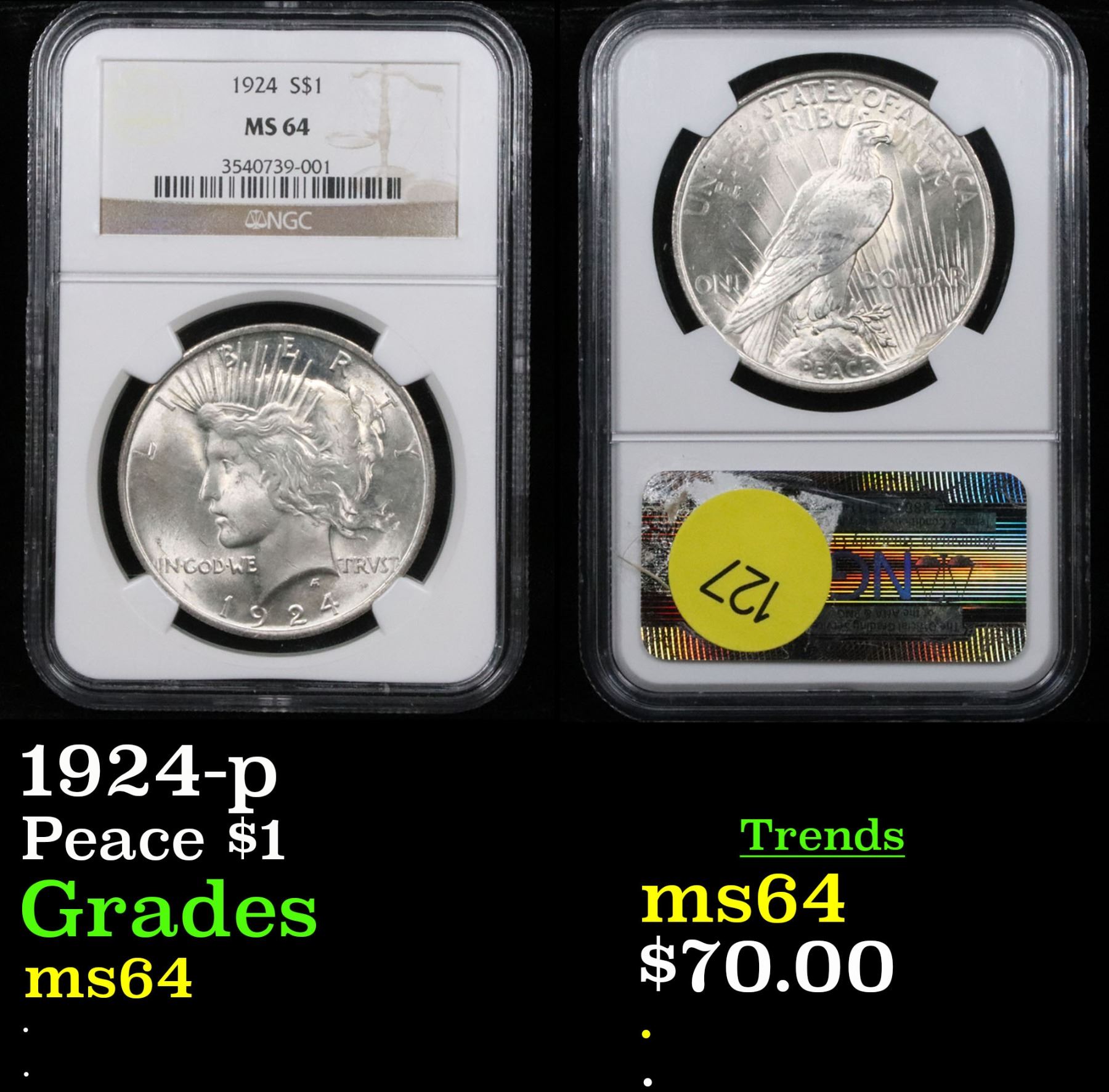 NGC 1924-p . . Peace Dollar $1 Graded ms64 By NGC.