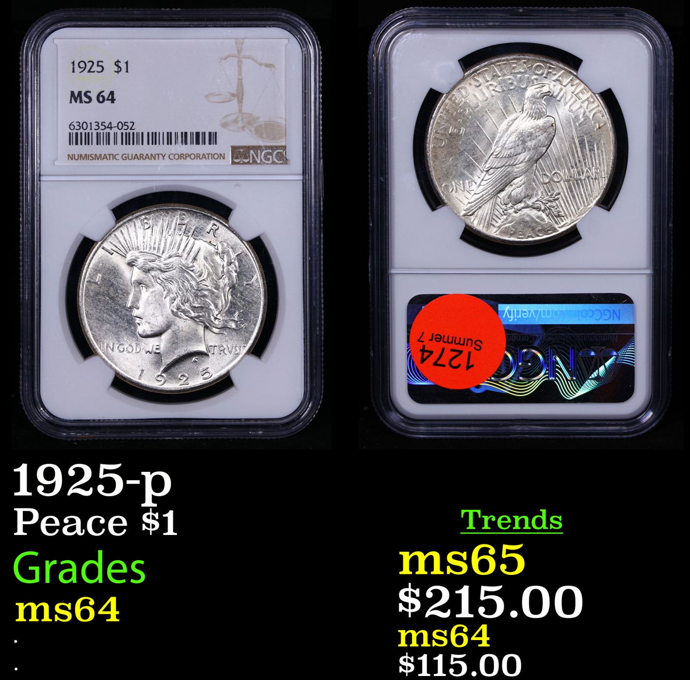 NGC 1925-p Peace Dollar $1 Graded ms64 By NGC.