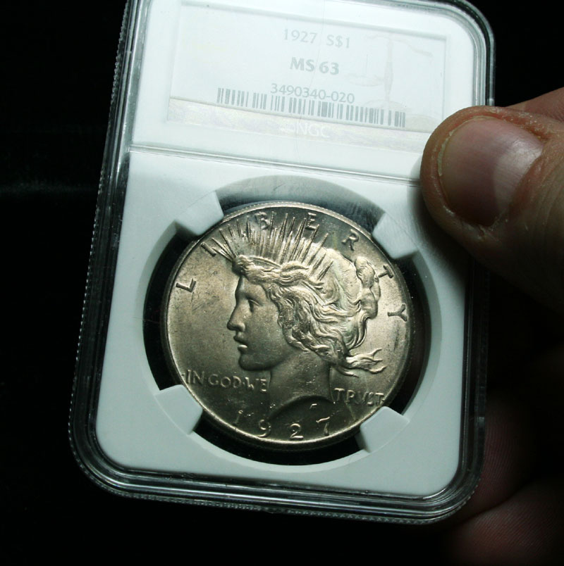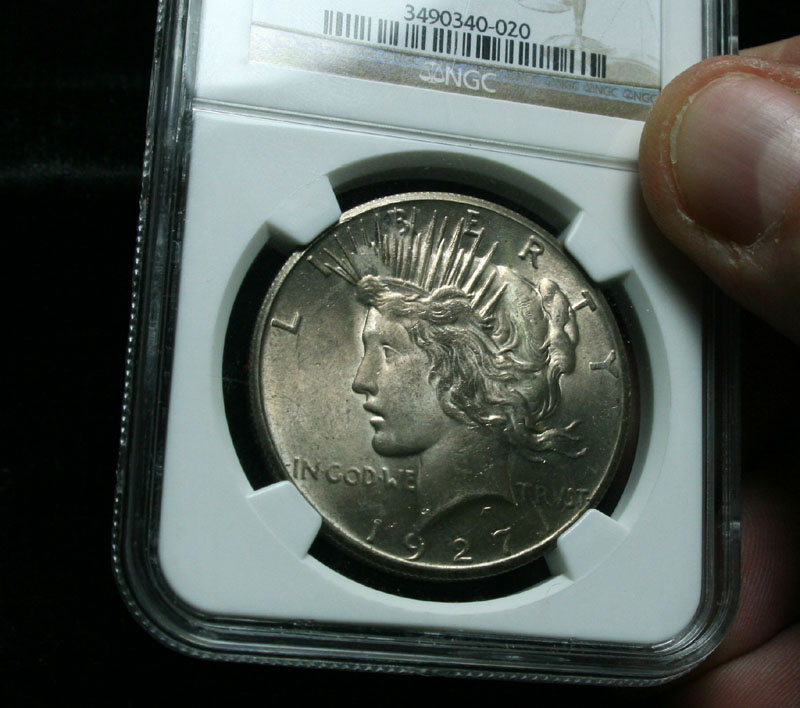 Stunning bronze toned example with excellent eye appeal a real PQ example, I feel its an ms64. Super PQ. The 27-p is the 2nd lowest minted Peace dollar in the entire series. Lower mintage than the 21-p, 34-s, or any other date than the 28-p. AA real Sleeper. It was graded by one of America's top 2 and harshest grading companies. The Wholesale Greysheet lists ms63 at $170 and ms64 at $410. Estimated Value $300