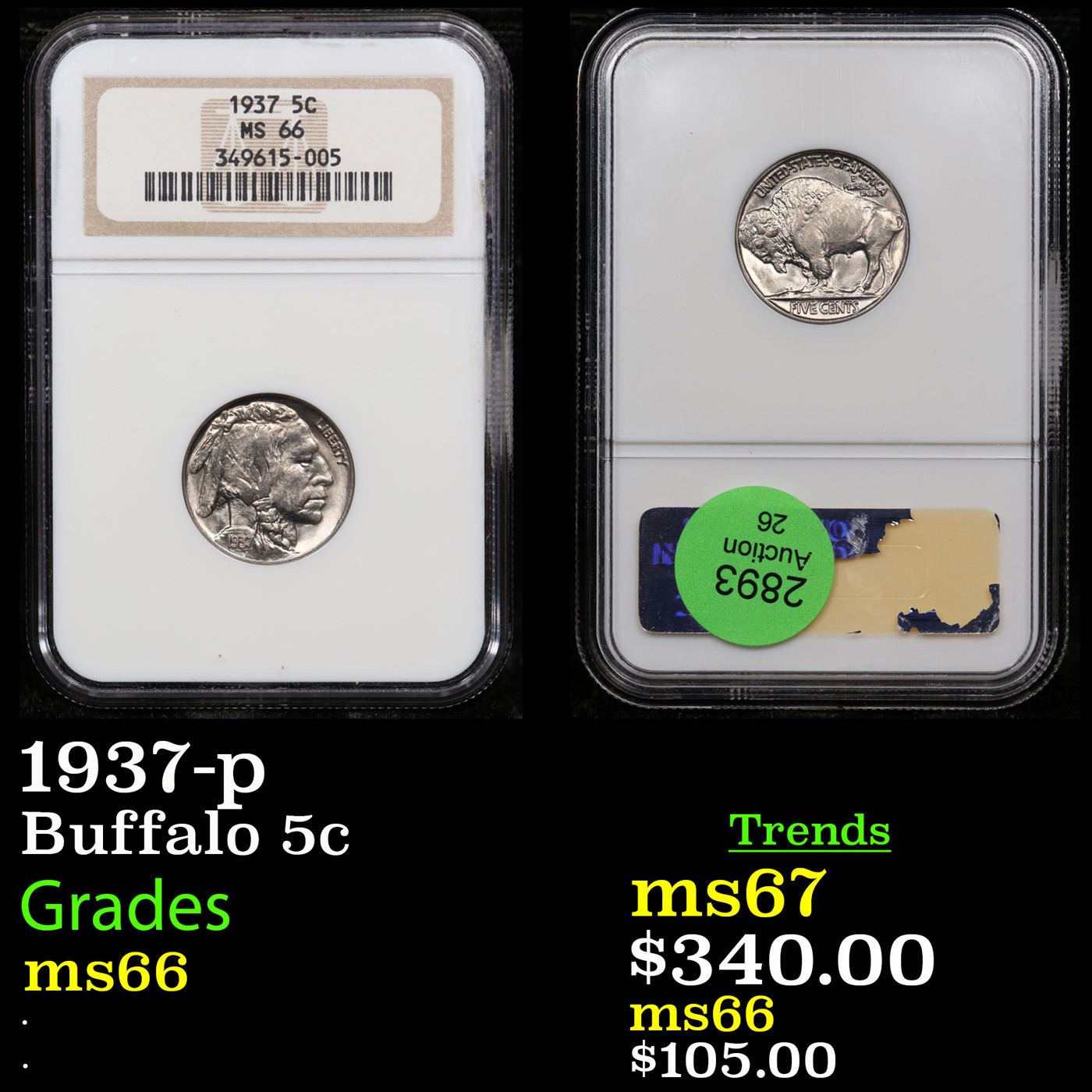 NGC 1937-p Buffalo Nickel 5c Graded ms66 By NGC.
