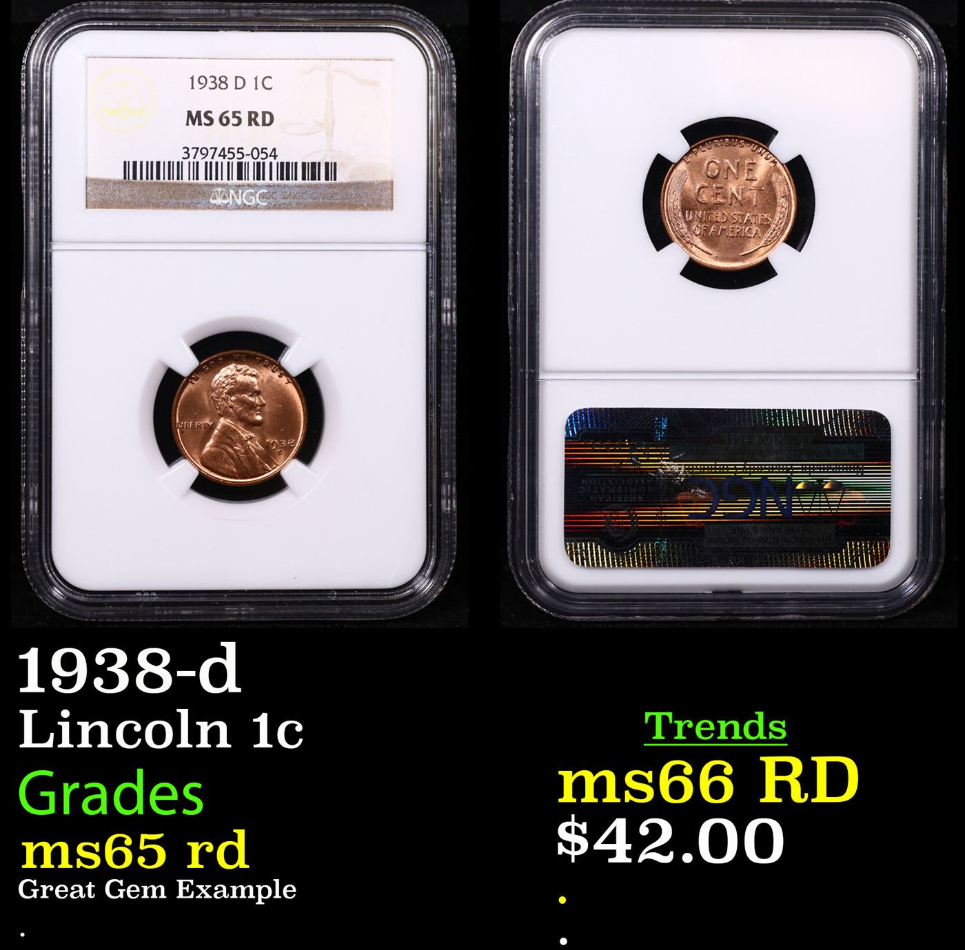 NGC 1938-d Lincoln Cent 1c Graded ms65 rd By NGC.