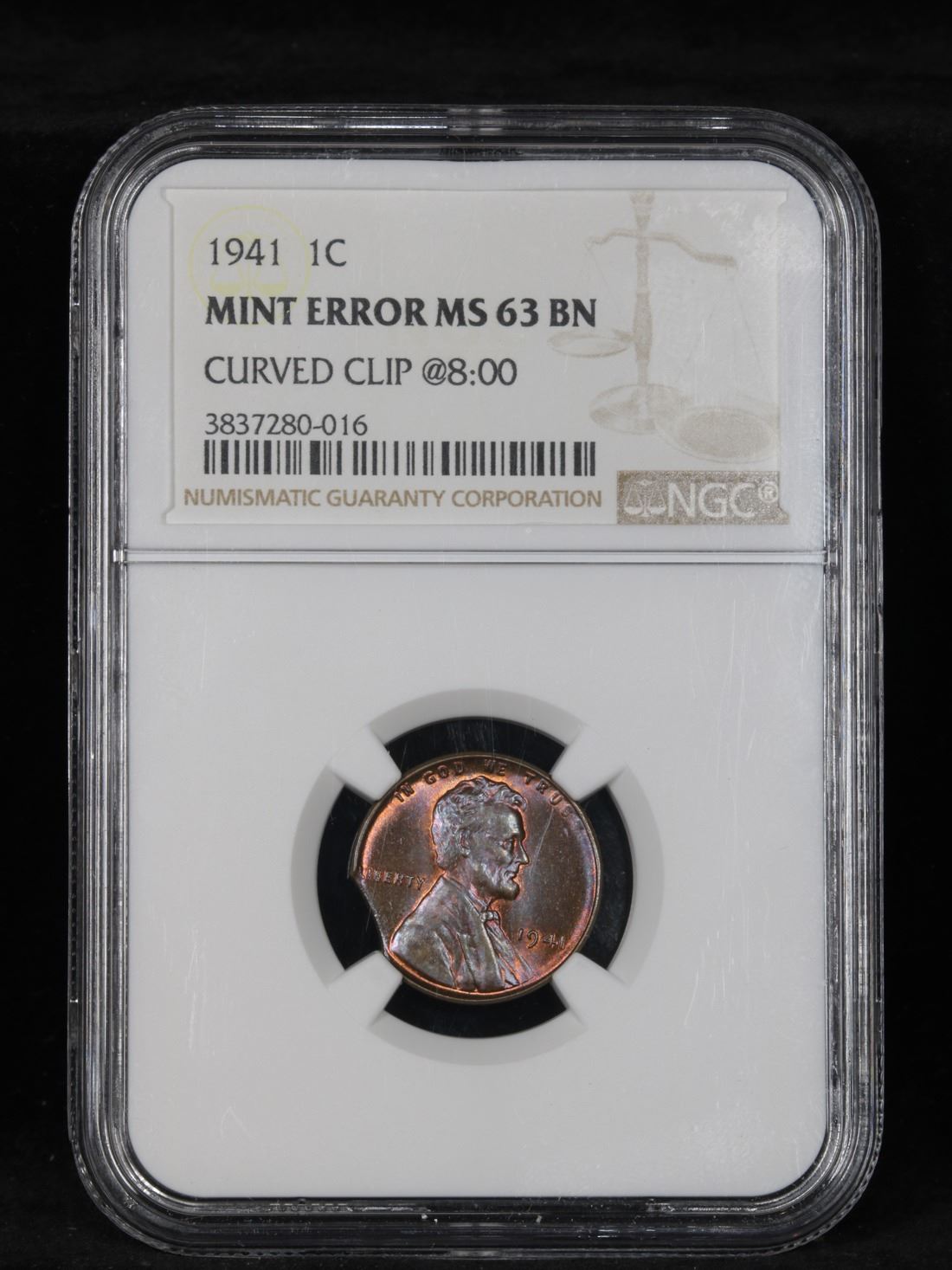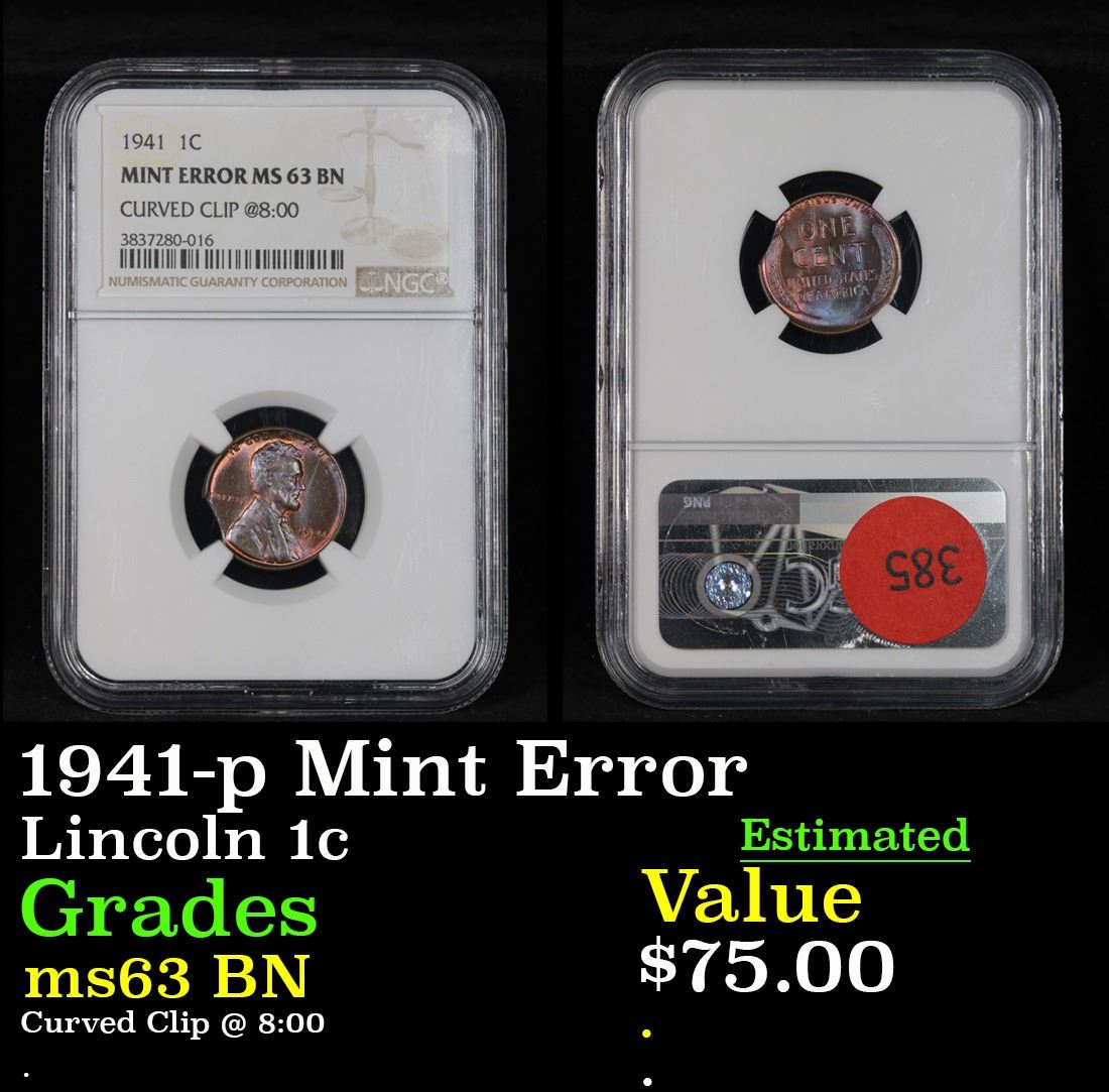 NGC 1941-p Mint Error Lincoln Cent 1c Graded ms63 BN By NGC. Curved Clip @ 8:00