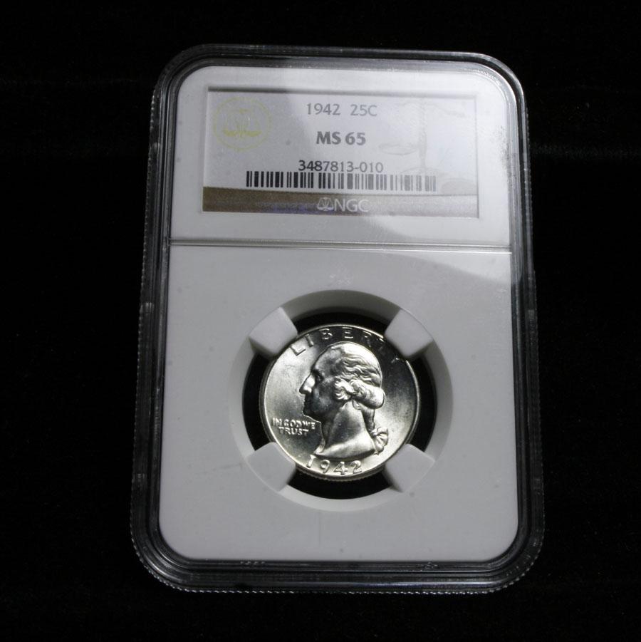 Quoting David Hall, head of PCGS "This coin (the 42-p) is scarcer in Gem condition than most of the other Washington quarter issues of this time period." PCGS lists ms65 at $45, and ms66 at $230. Estimated Value $60