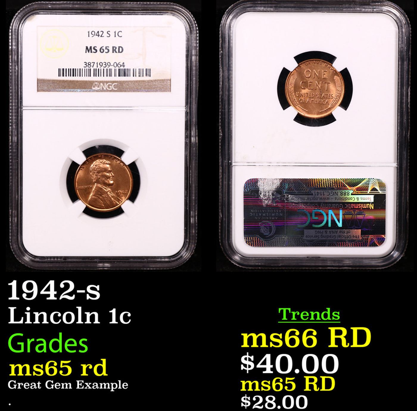 NGC 1942-s Lincoln Cent 1c Graded ms65 rd By NGC.