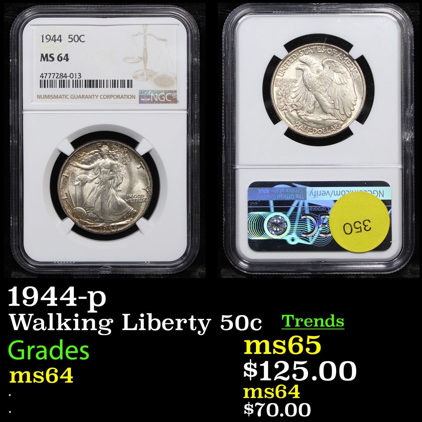 NGC 1944-p Walking Liberty Half Dollar 50c Graded ms64 By NGC.