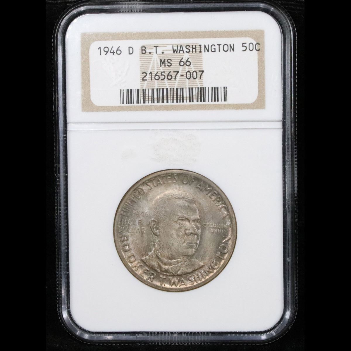 NGC 1946-d BTW . . Old Commem Half Dollar 50c Graded ms66 By NGC. When examining a Booker T. Washington commemorative look for wear on the high points, on the obverse that is Mr. Washington's right Cheek (from his perspective), and on the reverse the arches on the top building.