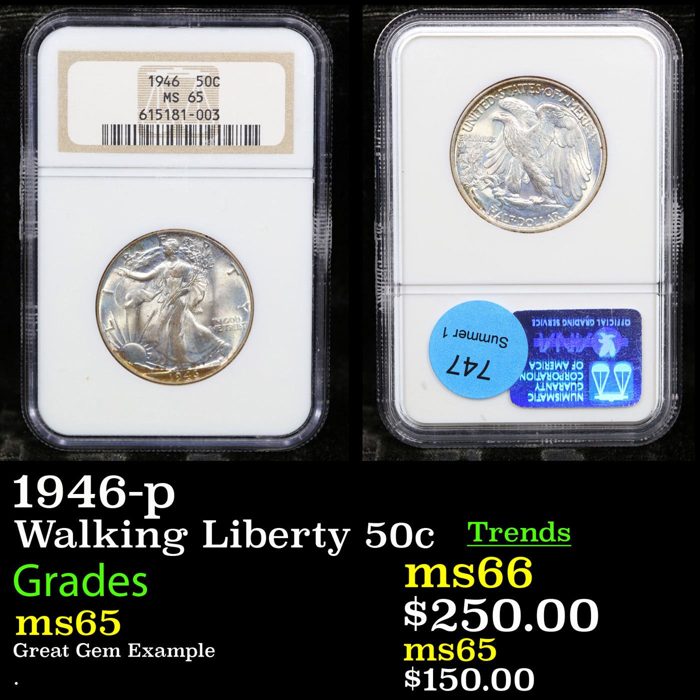 NGC 1946-p Walking Liberty Half Dollar 50c Graded ms65 By NGC.