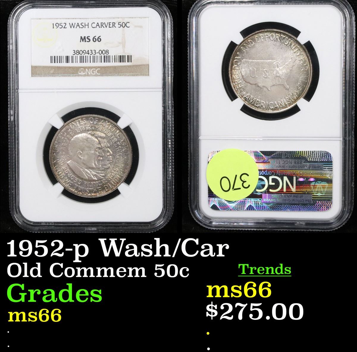 NGC 1952-p Wash/Car . . Old Commem Half Dollar 50c Graded ms66 By NGC. The Final Coin in the Old Commemorative Program. It was Minted to Revive the Ending Booker T Washington Commemorative and to Honor Washington Carver. When examining a Wash/Carver examine the High Points, which are Carver's cheek on the Obverse and the Center of the USA on the Reverse.