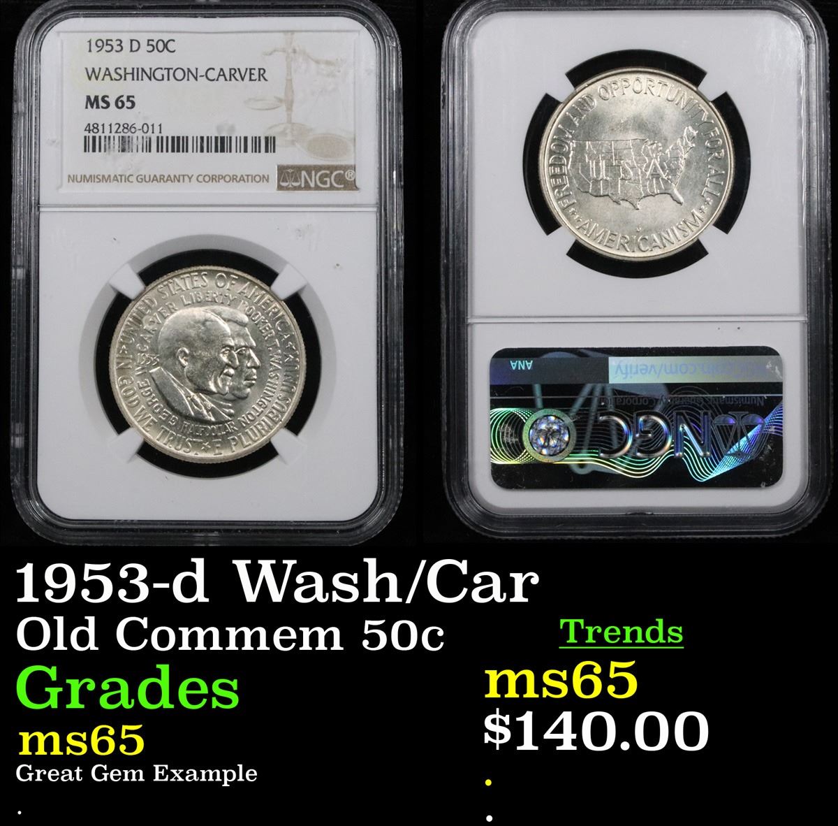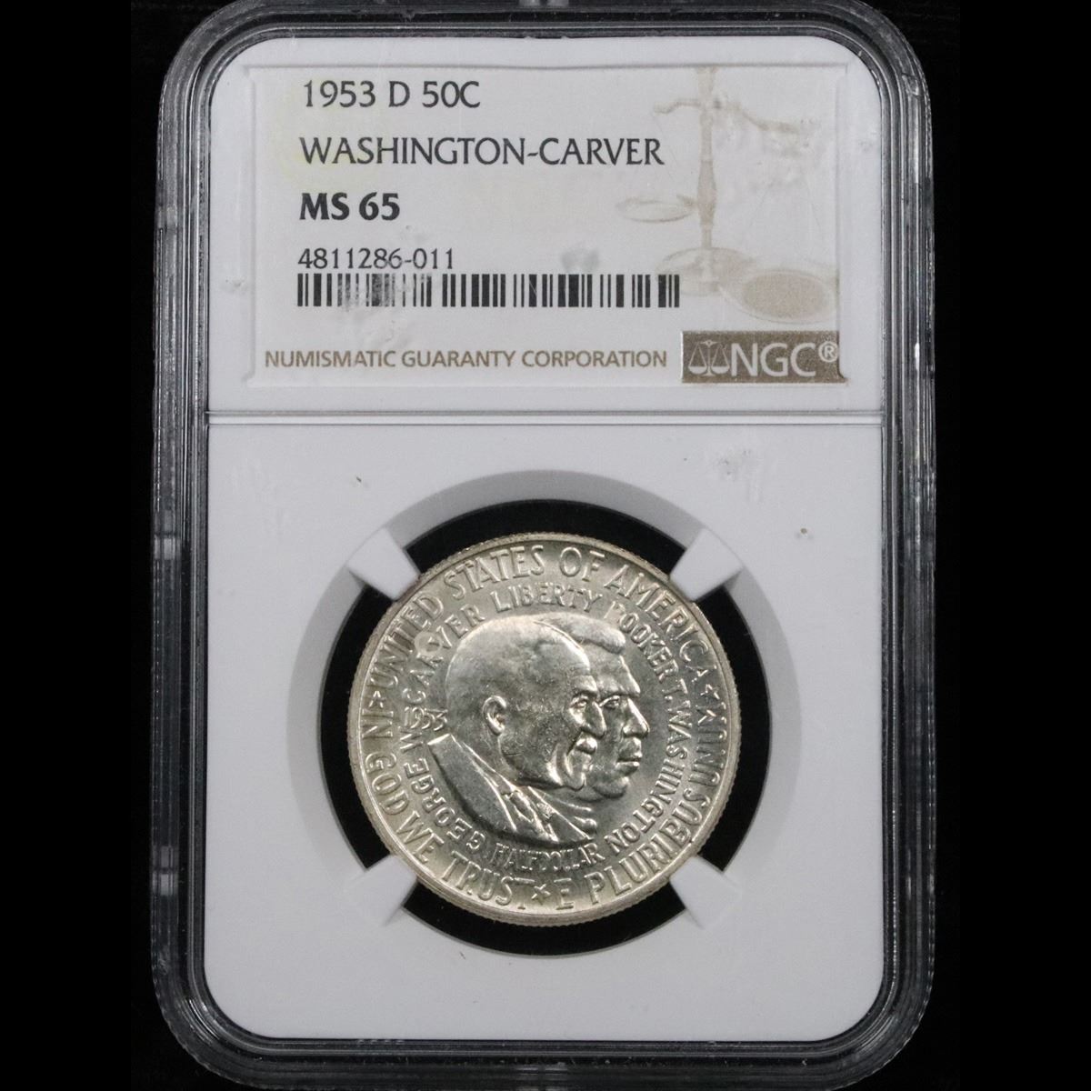 NGC 1953-d Wash/Car . Great Gem Example Old Commem Half Dollar 50c Graded ms65 By NGC. The Final Coin in the Old Commemorative Program. It was Minted to Revive the Ending Booker T Washington Commemorative and to Honor Washington Carver. When examining a Wash/Carver examine the High Points, which are Carver's cheek on the Obverse and the Center of the USA on the Reverse.