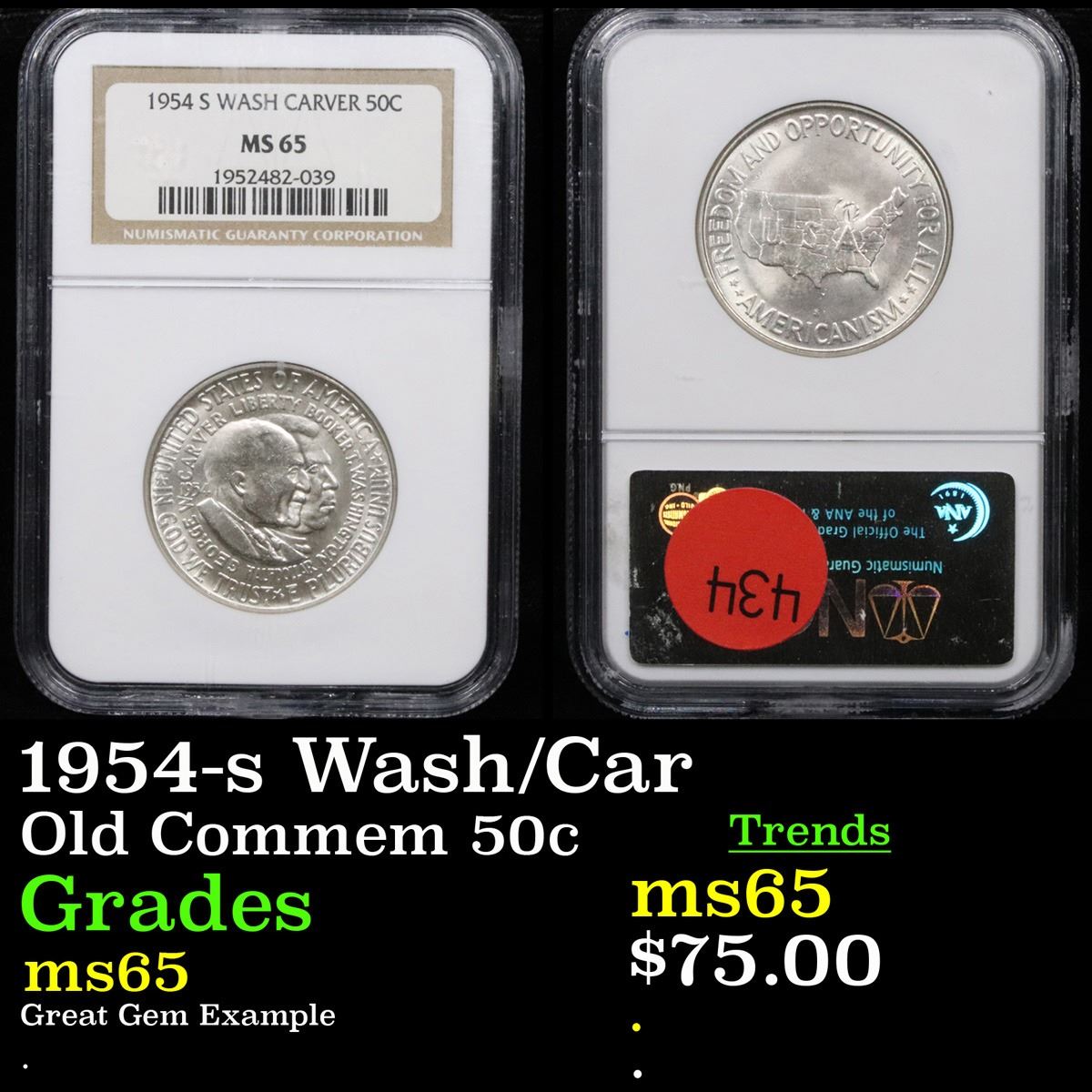 NGC 1954-s Wash/Car . Great Gem Example Old Commem Half Dollar 50c Graded ms65 By NGC. The Final Coin in the Old Commemorative Program. It was Minted to Revive the Ending Booker T Washington Commemorative and to Honor Washington Carver. When examining a Wash/Carver examine the High Points, which are Carver's cheek on the Obverse and the Center of the USA on the Reverse.