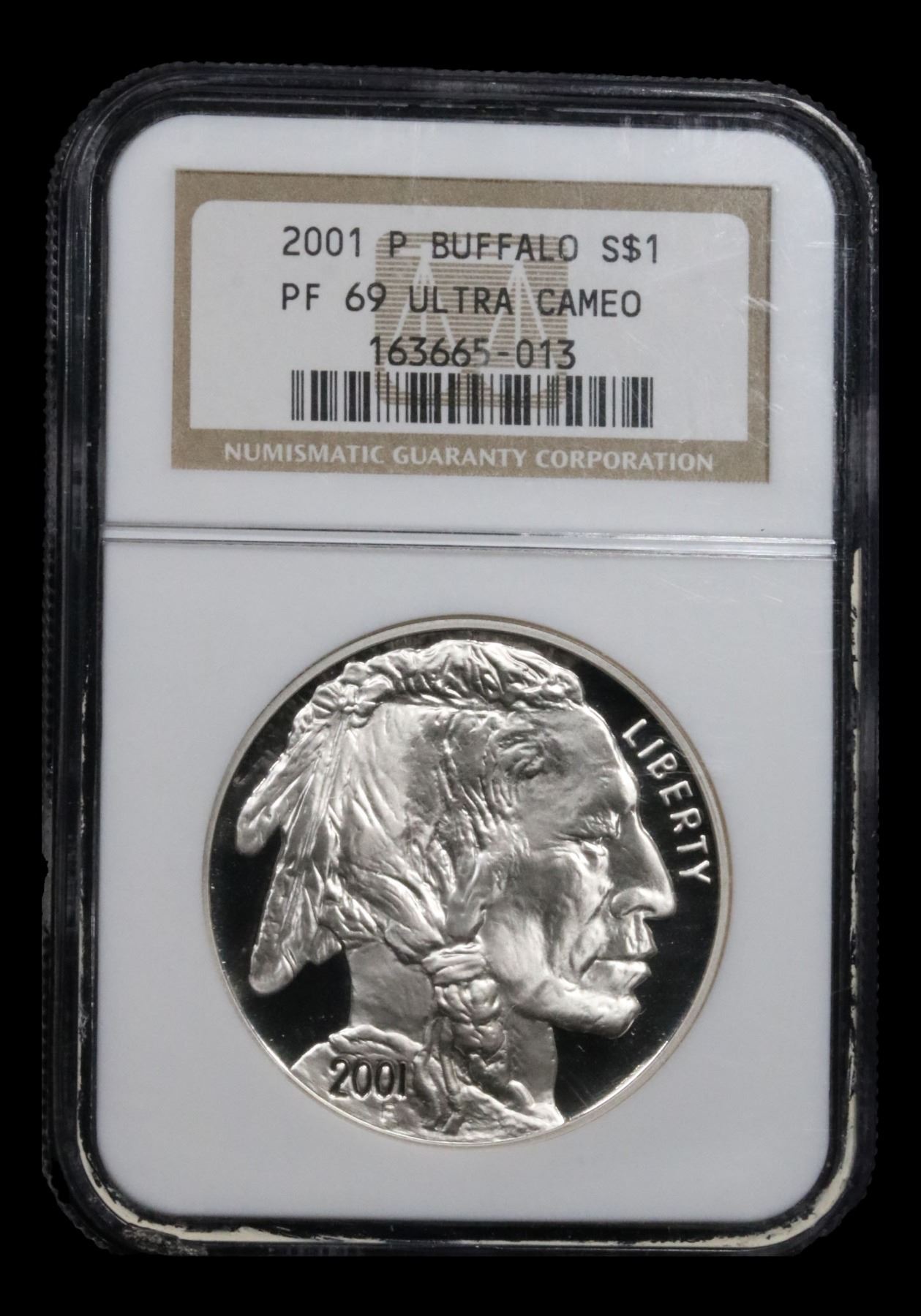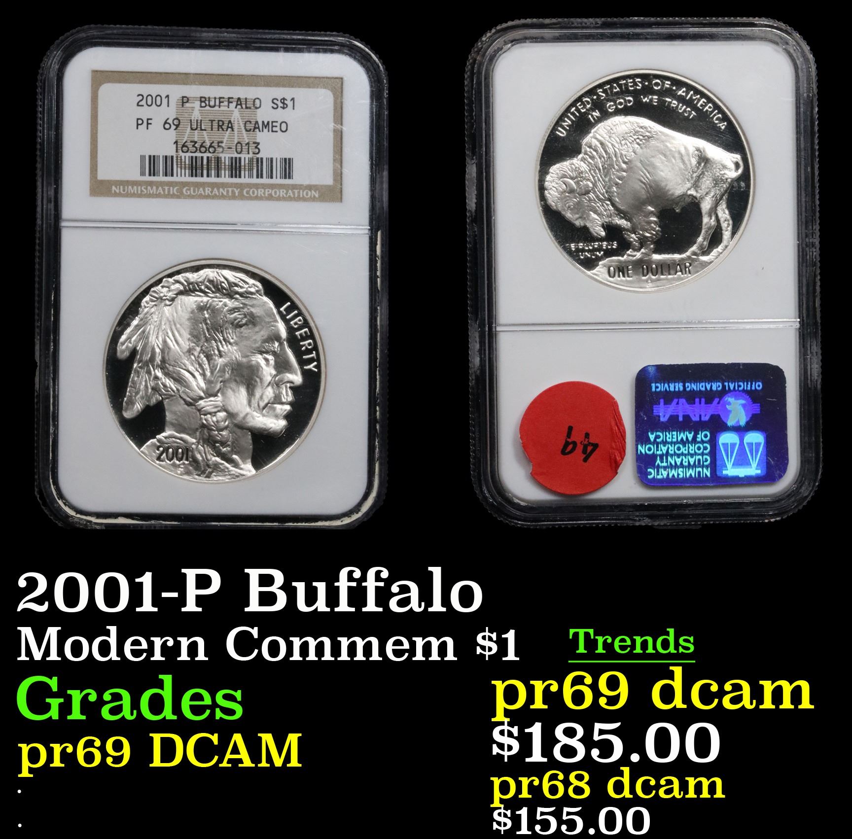 NGC 2001-P Buffalo Modern Commem Dollar $1 Graded pr69 DCAM By NGC. Rare and Highly Sought after. The 2001 American Buffalo Silver Dollar was issued to commemorate the recently opened National Museum of the American Indian (NMAI) of the Smithsonian Institution. The classic design of the coin after James Earle Fraser's Buffalo Nickel, made this commemorative coin issue immensely popular with collectors, leading to a prompt sell out. This Proof dollar is graded near perfect PR69 DCAM by NGC. Trends lists pr69dcam at $185.
