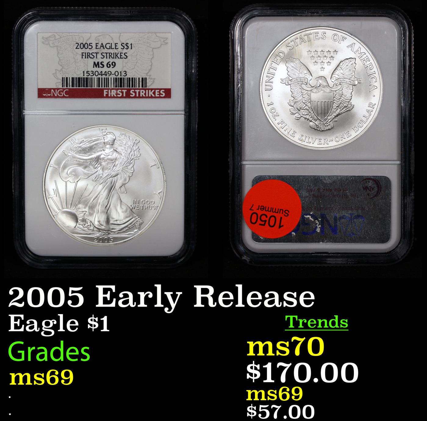 NGC 2005 Early Release Silver Eagle Dollar $1 Graded ms69 By NGC. This coin qualify as "Early Release" by NGC because it was made in the first 30 days of the Mint's Release.