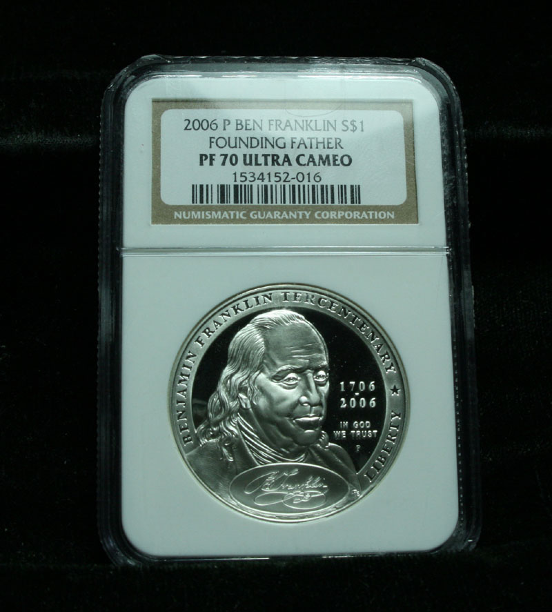 An actual Piece of Perfection. Accurately graded PF70 Ultra Cameo by NGC, one of America's top 2 grading companies in America. This coin was issued in two varieties. One scientist and one founding father. Both are issued to commemorate the 300th birthday of Franklin's birth. PCGS lists PR70 at $550. Estimated Value $300