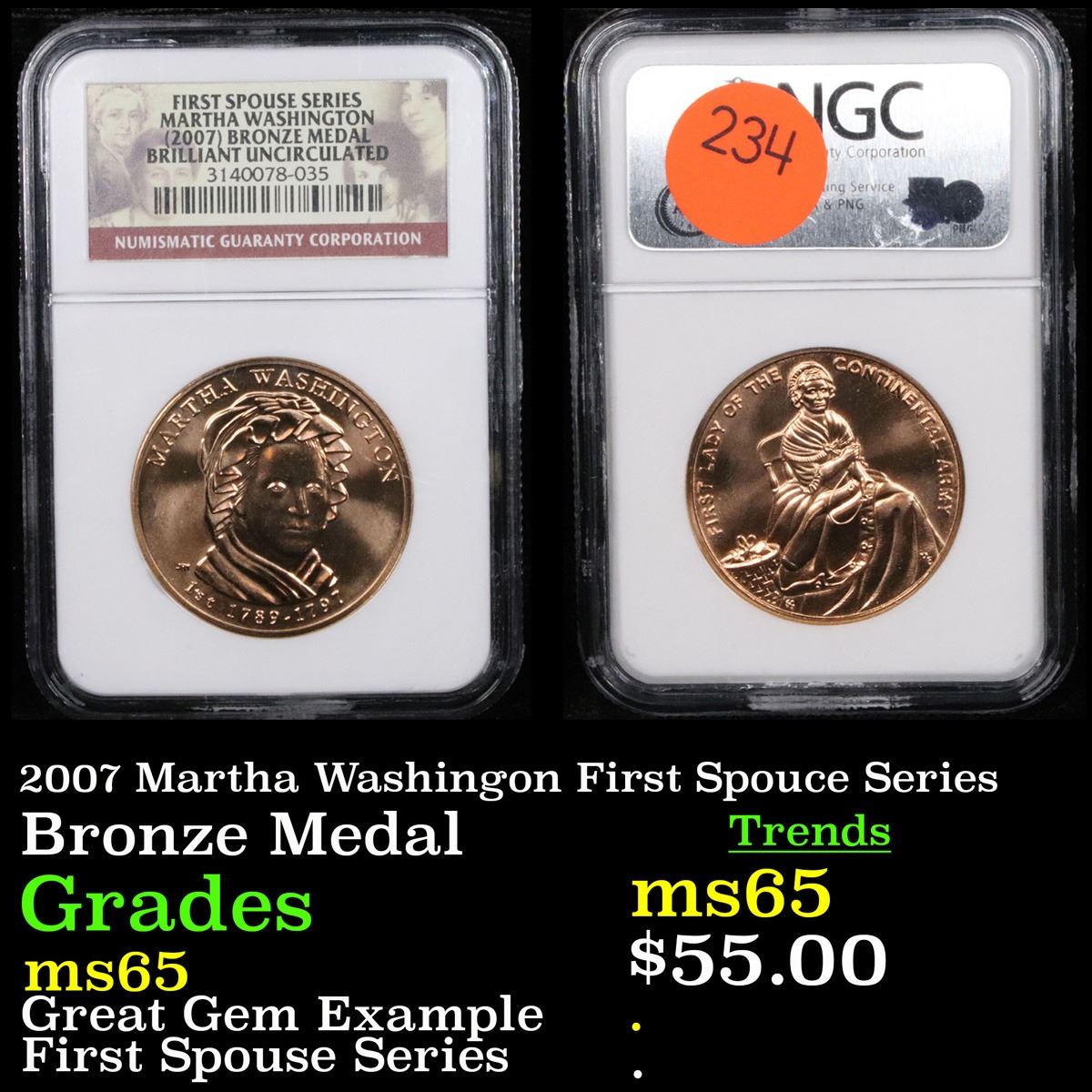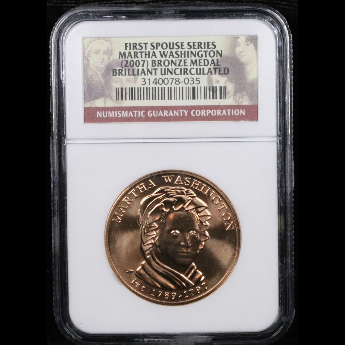 NGC 2007 Martha Washingon First Spouce Series First Spouse Series Great Gem Example Bronze Medal Graded ms65 By NGC.