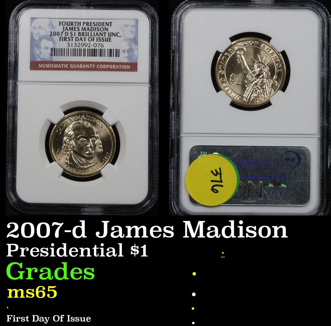 NGC 2007-d James Madison First Day Of Issue Presidential Dollar $1 Graded GEM By NGC.