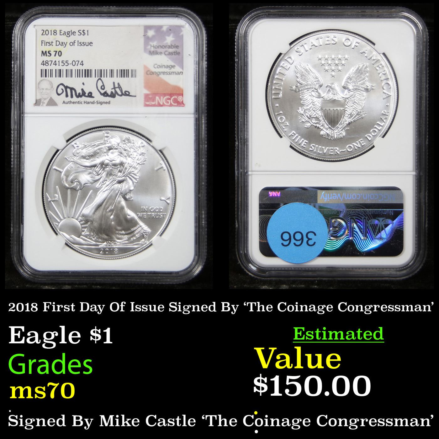 NGC 2018 First Day Of Issue Signed By 'The Coinage Congressman' Silver Eagle Dollar $1 Graded ms70 By NGC. Known as "The Coinage Congressman," the Honorable Mike Castle introduced legislation that authorized a number of important modern US coin programs while he served as a member of the US House of Representatives from 1993–2011. He authored and / or sponsored bills that resulted in the transformative 50 States Quarters Program, the Sacagawea Dollar, the Presidential Dollar Series and numerous commemoratives.