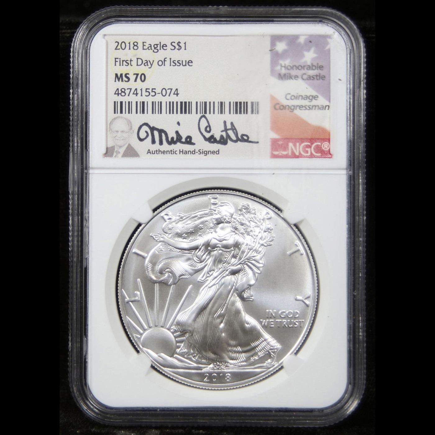 NGC 2018 First Day Of Issue Signed By 'The Coinage Congressman' Silver Eagle Dollar $1 Graded ms70 By NGC.