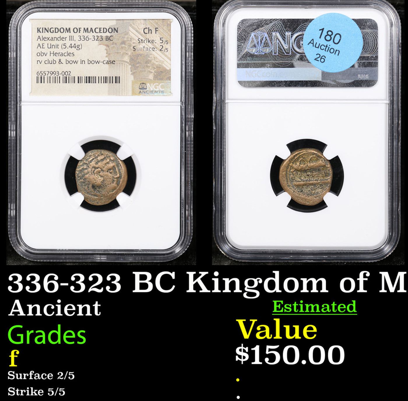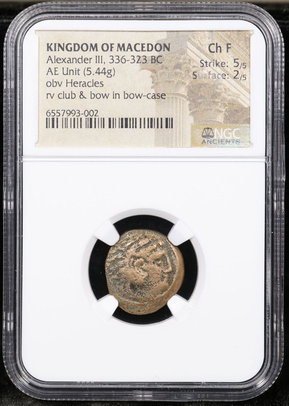 NGC 336-323 BC Kingdom of Macedon AE Unit, Alexander III Obv. Heracles, Rev. Club & Bow Ancient Graded f By NGC.