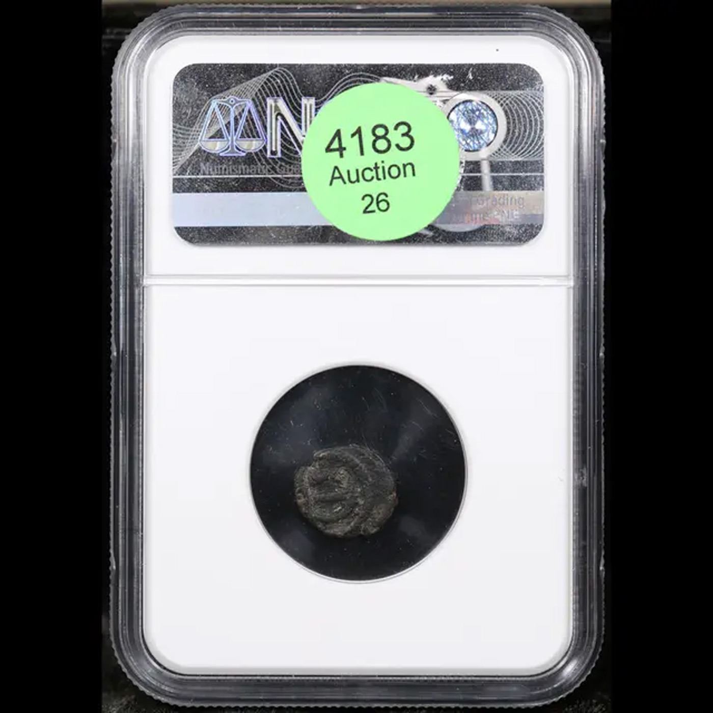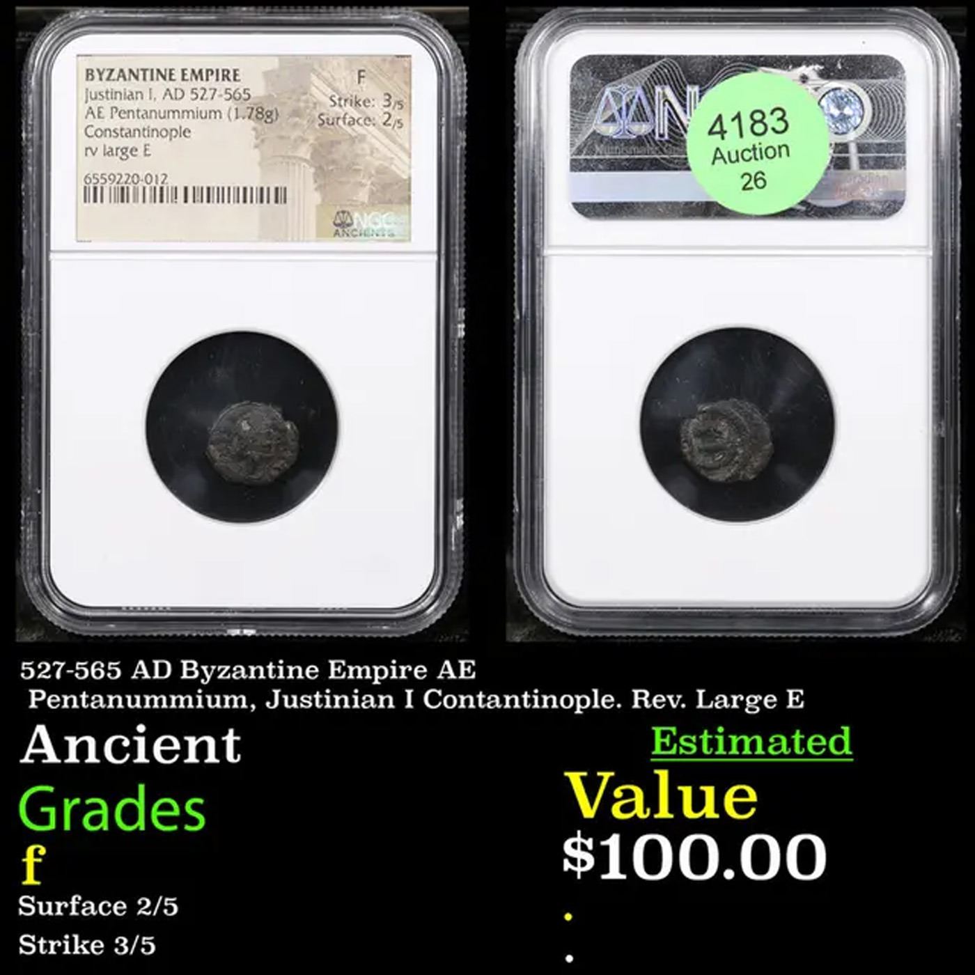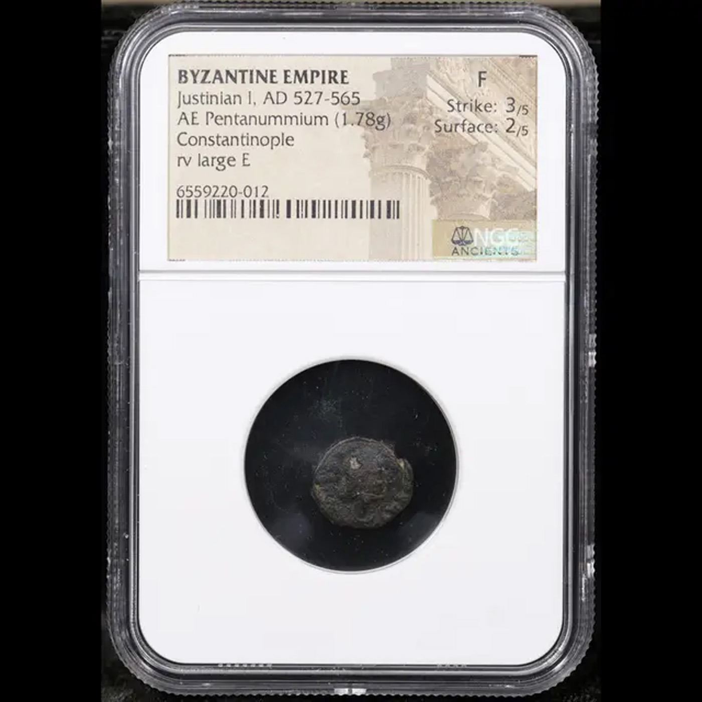 NGC 527-565 AD Byzantine Empire AE Pentanummium, Justinian I Contantinople. Rev. Large E Ancient Graded f By NGC.